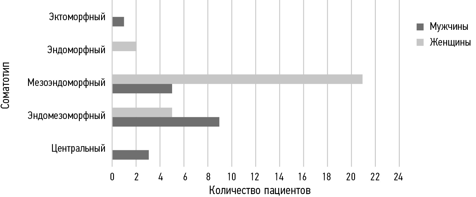 Результаты соматотипирования по Хит–Картеру с применением биоимпедансного анализа среди пациентов с циррозом печени отражены на рис. 1. Среди обследованных женщин был наиболее распространён мезоэндоморфный соматотип, среди мужчин — эндомезоморфный. При этом не выявлено пациентов с мезоэктоморфным и сбалансированным мезоморфным соматотипами.