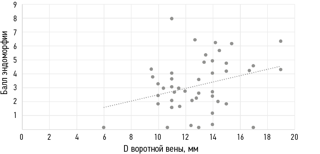 Рис. 2. Корреляция между баллом эндоморфии и D воротной вены печени, мм
