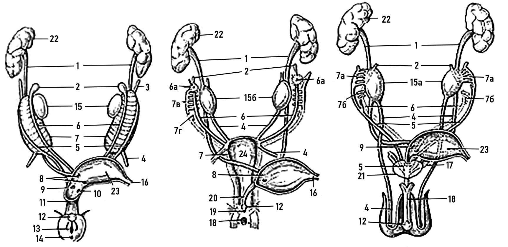 Рис. 1. Индифферентная закладка мочеполовой системы и её дальнейшее развитие у зародышей женского и мужского пола: a — и ндифферентная закладка; b — д альнейшее развитие у зародыша женского пола; c — р азвитие закладки мочеполовой системы у зародыша мужского пола (по Корнингу, цитируется по: Заварзин А.А. Сравнительная гистология: учебник / под ред. О.Г. Строевой. Санкт-Петерург : Издательство Санкт-Петербургского университета, 2000. 520 с.).