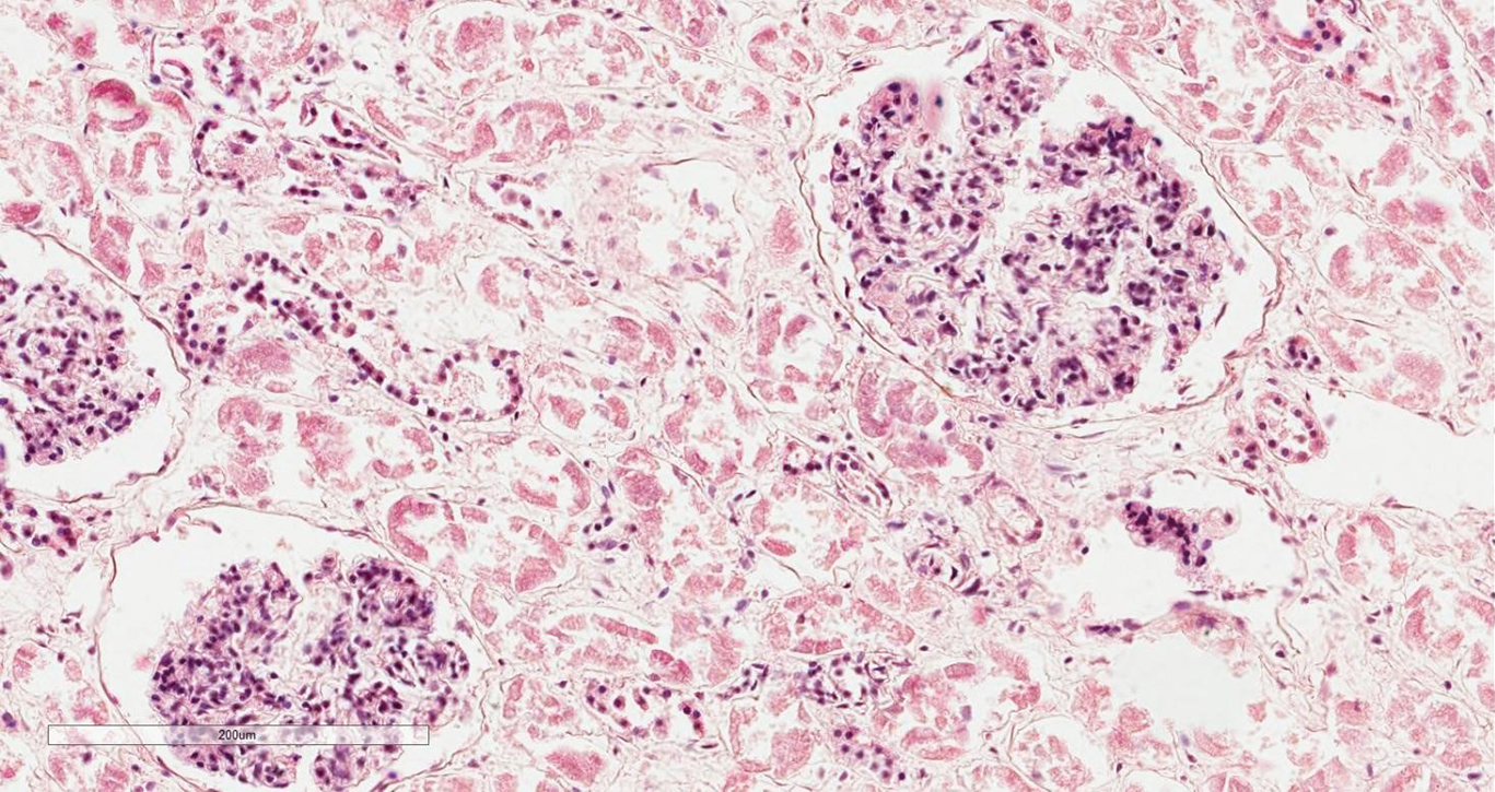 Основными морфологическими проявлениями некротического нефроза ишемического характера являются истончение или упрощение канальцевого эпителия с потерей щёточной каймы и вздутием апикальной цитоплазмы с усилением эозинофильного окрашивания. Ядра нефроцитов характеризуются конденсацией хроматина, усилением базофильного окрашивания или потерей чёткого контура ядра. Просветы канальцев заполнены отслоившимися некротическими эпителиальными клетками канальцев, остатками фибрина или гиалиновыми цилиндрами (рис. 2).