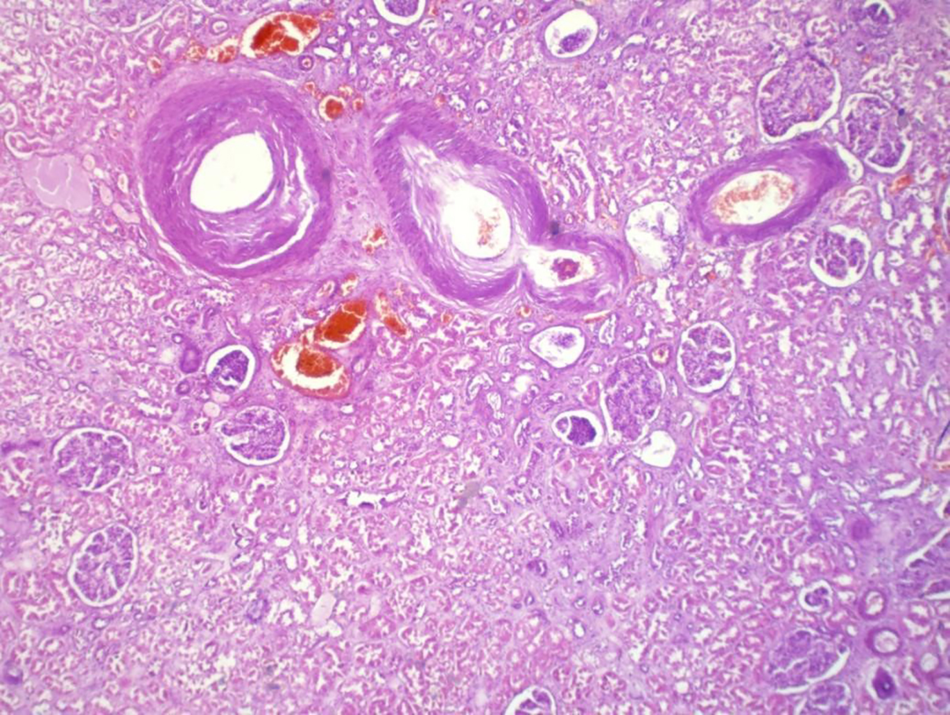 Рис. 4. Выраженный артериосклероз и гиалиноз сосудов почки у пациентки с тяжёлой преэклампсией на фоне сахарного диабета. Окраска гематоксилином и эозином; ×40.