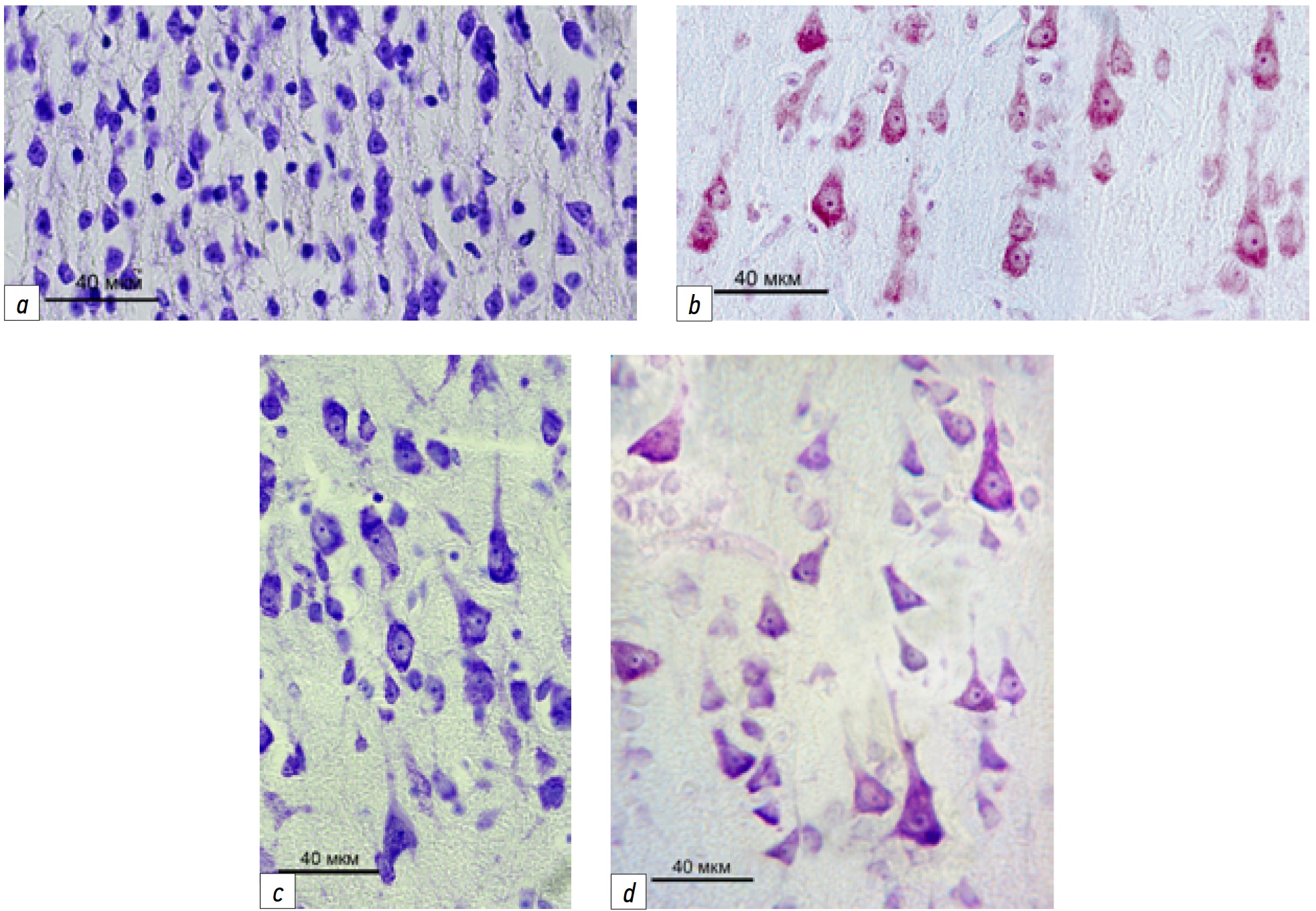 Каждый образец ткани мозга обезвоживали в спиртах с увеличением концентрации и заливали в парафин, затем из парафиновых блоков изготавливали фронтальные серийные срезы толщиной 10 мкм. Из каждой серии произвольно выбирали по 4 среза, которые окрашивали крезиловым фиолетовым по методу Ниссля. Для дальнейшего анализа гистологических срезов использовали технологию Image Tools (National Institutes of Health, США) и программу геометрических измерений микрообъектов ImageExpert™ Gauge (NEXSYS, Россия, госреестр № 46532-11), а также микроскоп «Биолам-15» («ЛОМО», Россия) со встроенной USB-камерой UCMOS01300KPA («Альтами», Россия). С целью изучения толщины коры (ТК) и слоёв мы использовали алгоритмы программы для измерения расстояний между объектами. Чтобы измерить размеры клеток, мы выделяли изображение одного или нескольких нейронов от фона автоматически с учётом оптической плотности, позволяющей чётко различать форму нейрона, его ядро и ядрышко. В таком случае мы предполагали, что срез проходит через центральную плоскость клетки с наибольшей площадью нейрона на срезе. Результаты измерений площади профильных полей выбранных нейронов записывали в файл Excel для дальнейшей статистической обработки.