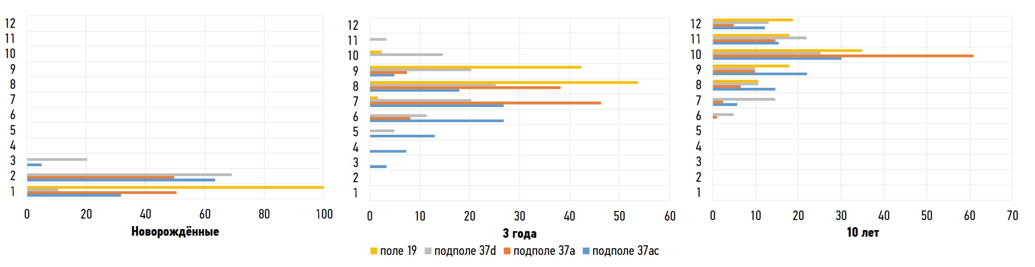 К 3 годам большая часть ПН имела средние размеры в пределах 5–8-х классов: в подполе 37ас — 84,5%, в подполе 37а — 92,6%, в подполе 37d и поле 19 — 55,3%. Нейроны крупного размера 9–10-х классов присутствовали в особой центральной зоне подполя 37d, где составили 38,2% от всех ПН, и в поле 19, где составили 44,7%. К 10–12 годам в слое III задней ассоциативной коры относительное содержание ПН, относящихся к сверхмалому и малым размерным классам, было статистически незначимо. Нейроны среднего размера в подполе 37ас составили 20,3%, в подполе 37а — 9,9%, в подполе 37d — 30,1% и в поле 19 — 10,6%. Остальные нейроны относились преимущественно к крупноклеточным классам, в числе которых сверхкрупные нейроны в подполях ТРО составили 5–13%, а в поле 19 — до 18%.