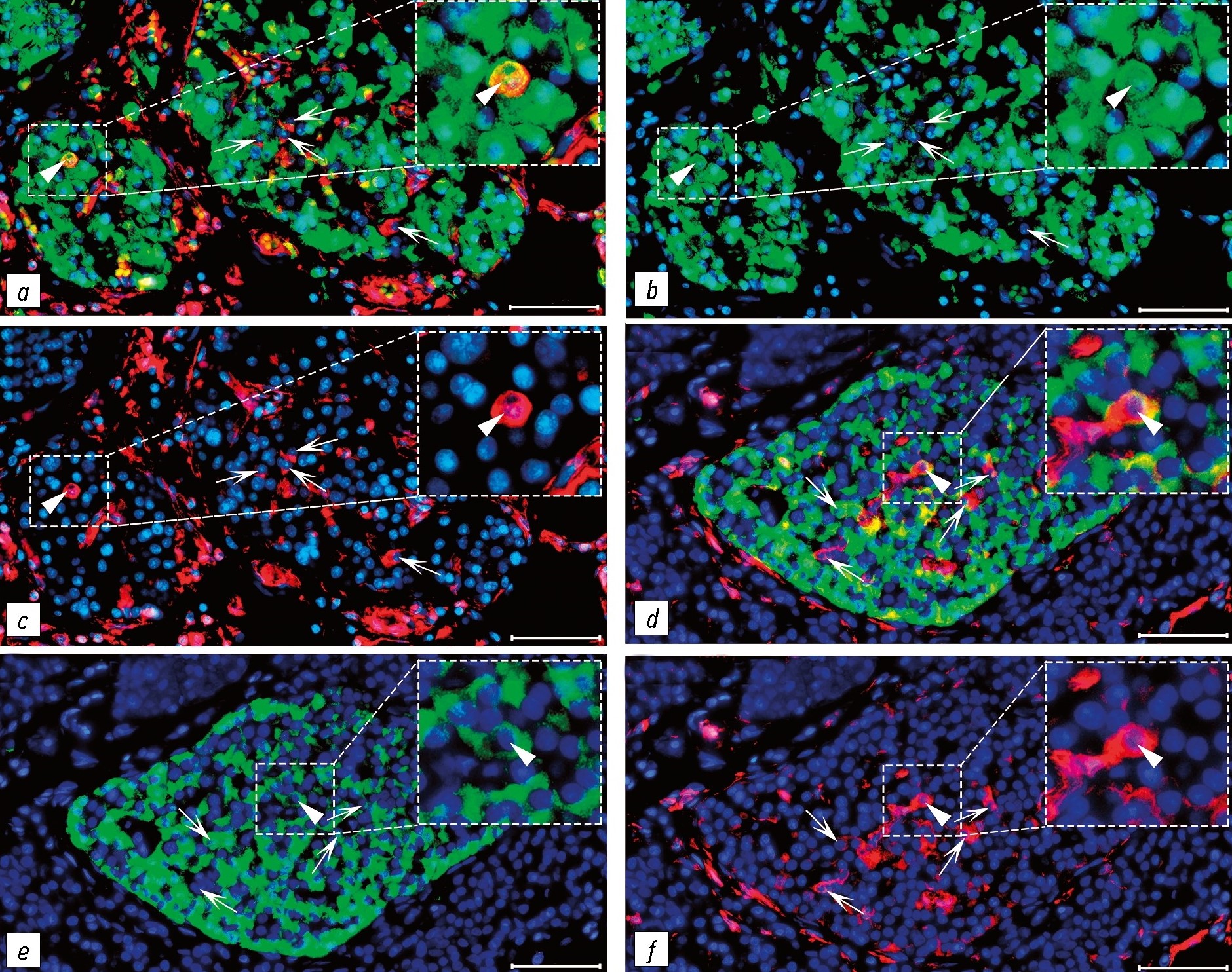 Fig. 1. Vimentin-positive cells (arrows) in the pancreatic islets of humans with T2D (woman, 67 years old): a–c: double immunofluorescent staining with antibodies to insulin (green) (b) and vimentin (red) (c); a — merged image; nuclei are stained by DAPI; arrowhead in the dotted square indicates enlarged image of cell with co-localization of insulin and vimentin; d–f: double immunofluorescent staining with antibodies to glucagon (green) (d) and vimentin (red) (f); d — merged image; nuclei are stained by DAPI; arrowhead in the dotted square indicates enlarged image of cell with co-localization of glucagon and vimentin. Bar — 50 µm