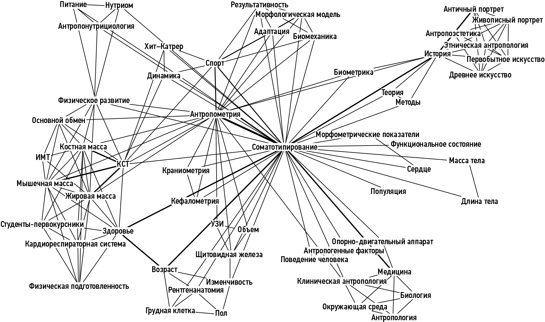 Рис. 1. Граф-схема связей ключевых слов в обзорах литературы, посвящённых соматотипированию, с 2013 по 2023 год. ИМТ — индекс массы тела, КСТ — компонентный состав тела