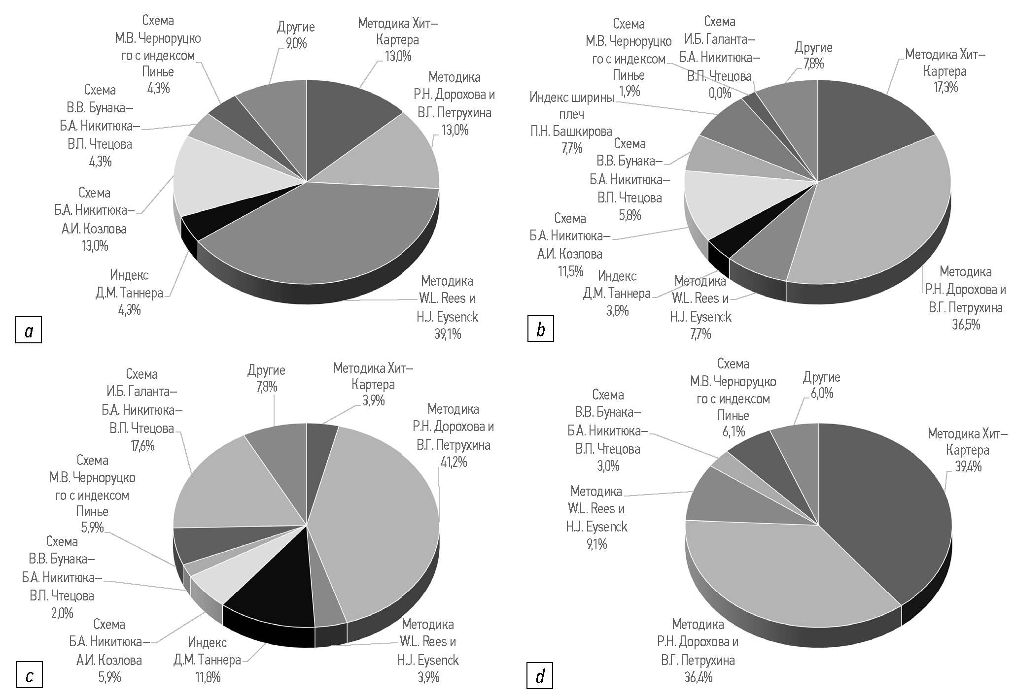 При соматотипировании обучающихся в вузах наиболее востребована методика соматотипирования Р.Н. Дорохова и В.Г. Петрухина — 36% упоминаний (рис. 4, b). При соматотипировании женщин и девушек также чаще всего используют методику Р.Н. Дорохова и В.Г. Петрухина — 41% случаев — и соматотипирование по схеме И.Б. Галанта–Б.А. Никитюка–В.П. Чтецова — 17% случаев (рис. 4, c). При соматотипологических исследованиях в спортивной медицине чаще всего применяют методику Хит–Картера — 40% и методику Р.Н. Дорохова и В.Г. Петрухина — 36% (рисунок 4, d).
