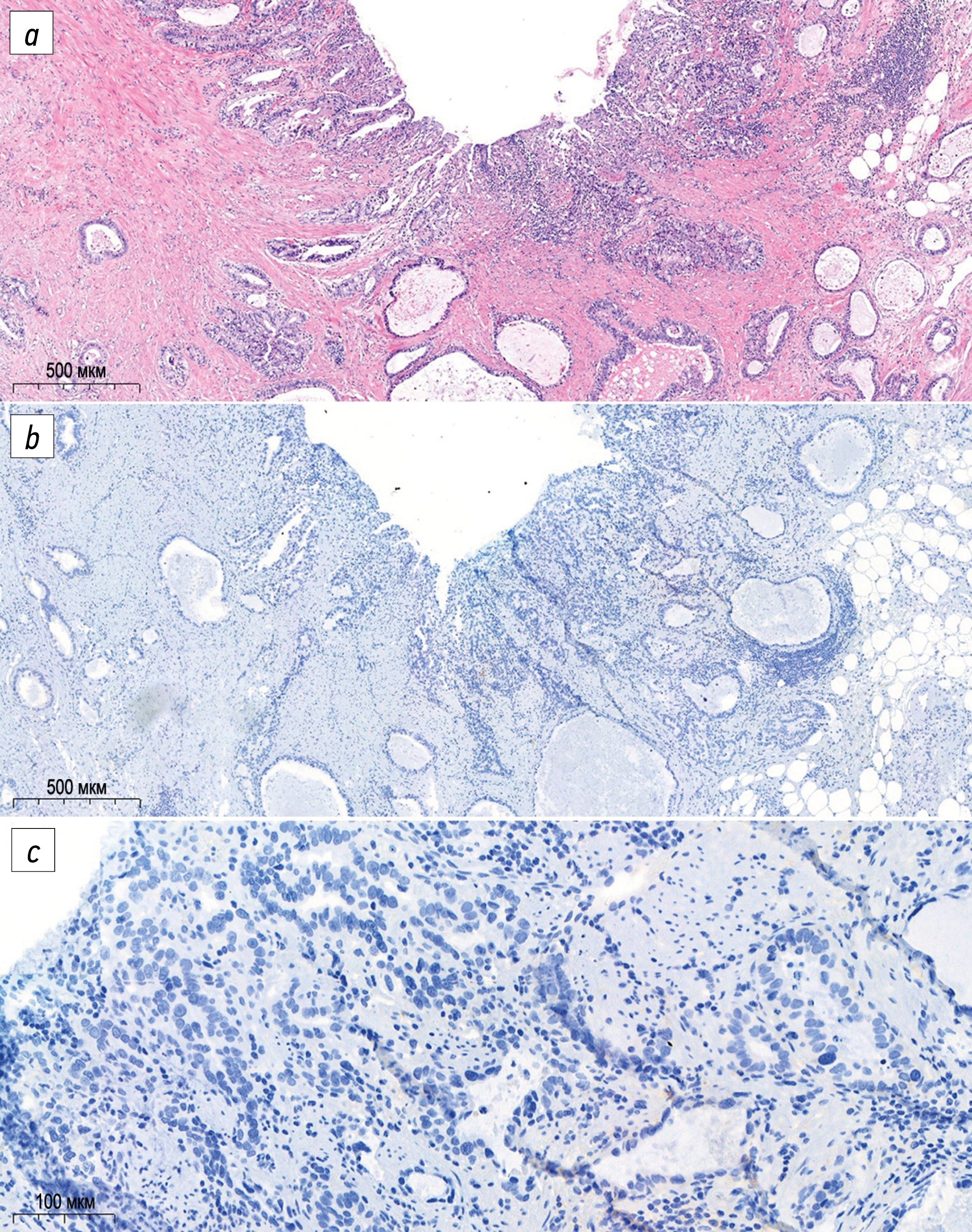 Рис. 1. Отсутствие экспрессии PD-L1 (PBM-1A4) в тубулярной карциноме желудка: а — тубулярная аденокарцинома желудка, окраска гематоксилином и эозином; об. ×5; b — отсутствие экспрессии PD-L1 в опухоли, иммуногистохимическая реакция с антителами к PD-L1 (PBM-1A4), об. ×5; c — отсутствие экспрессии PD-L1 в опухоли, иммуногистохимическая реакция с антителами к PD-L1 (PBM-1A4), об. ×20.