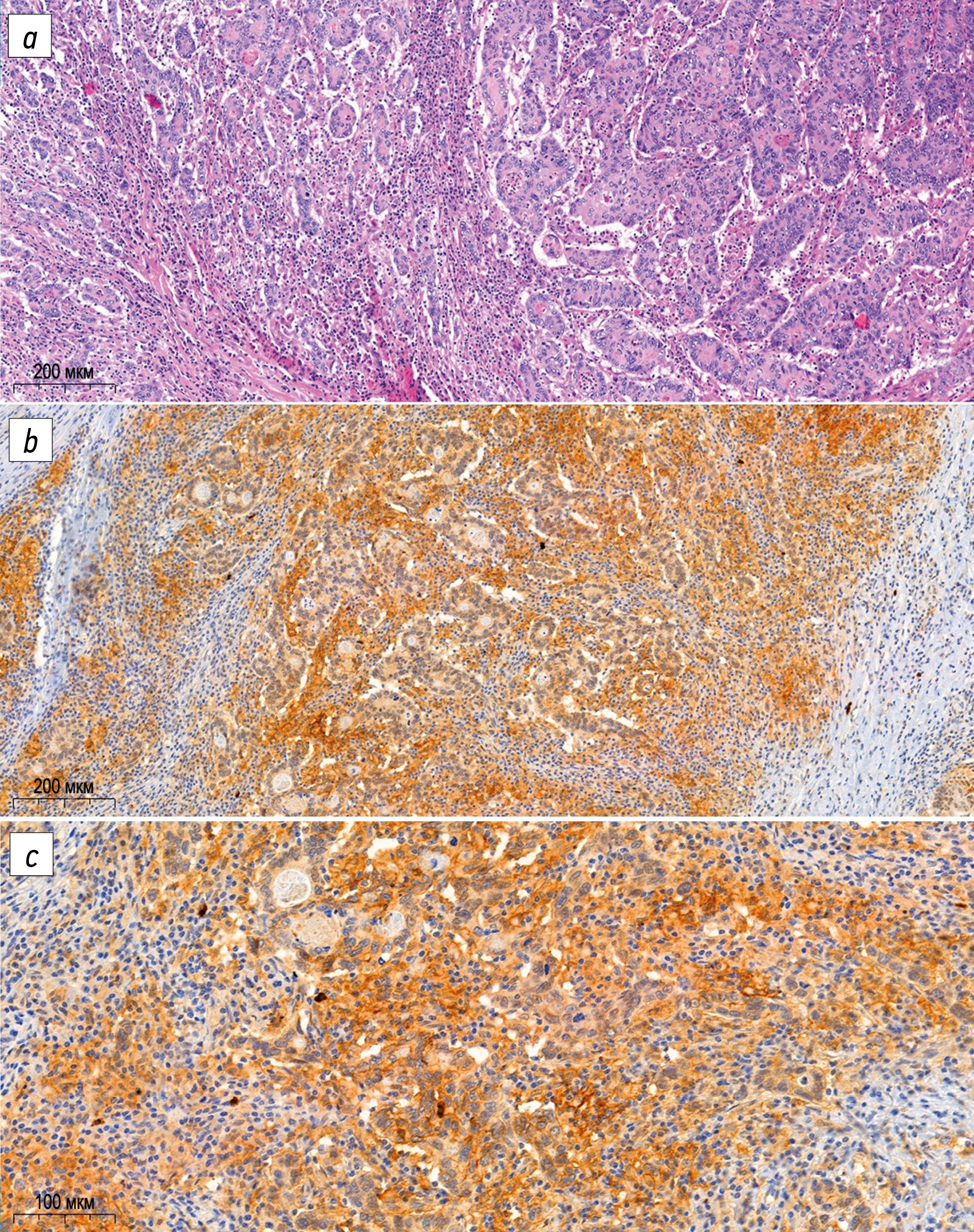 Fig. 2. Expression of PD-L1 (PBM-1A4) in gastric tubular adenocarcinoma: a — tubular adenocarcinoma of the stomach, hematoxylin and eosin staining, magn. ×10; b — PD-L1 expression in gastric cancer (CPS > 50, 4 points, positive), immunohistochemical reaction with antibodies to PD-L1 (PBM-1A4), magn. ×10; c — PD-L1 expression in gastric cancer (CPS > 50, 4 points, positive), immunohistochemical reaction with antibodies to PD-L1 (PBM-1A4), magn. ×20.