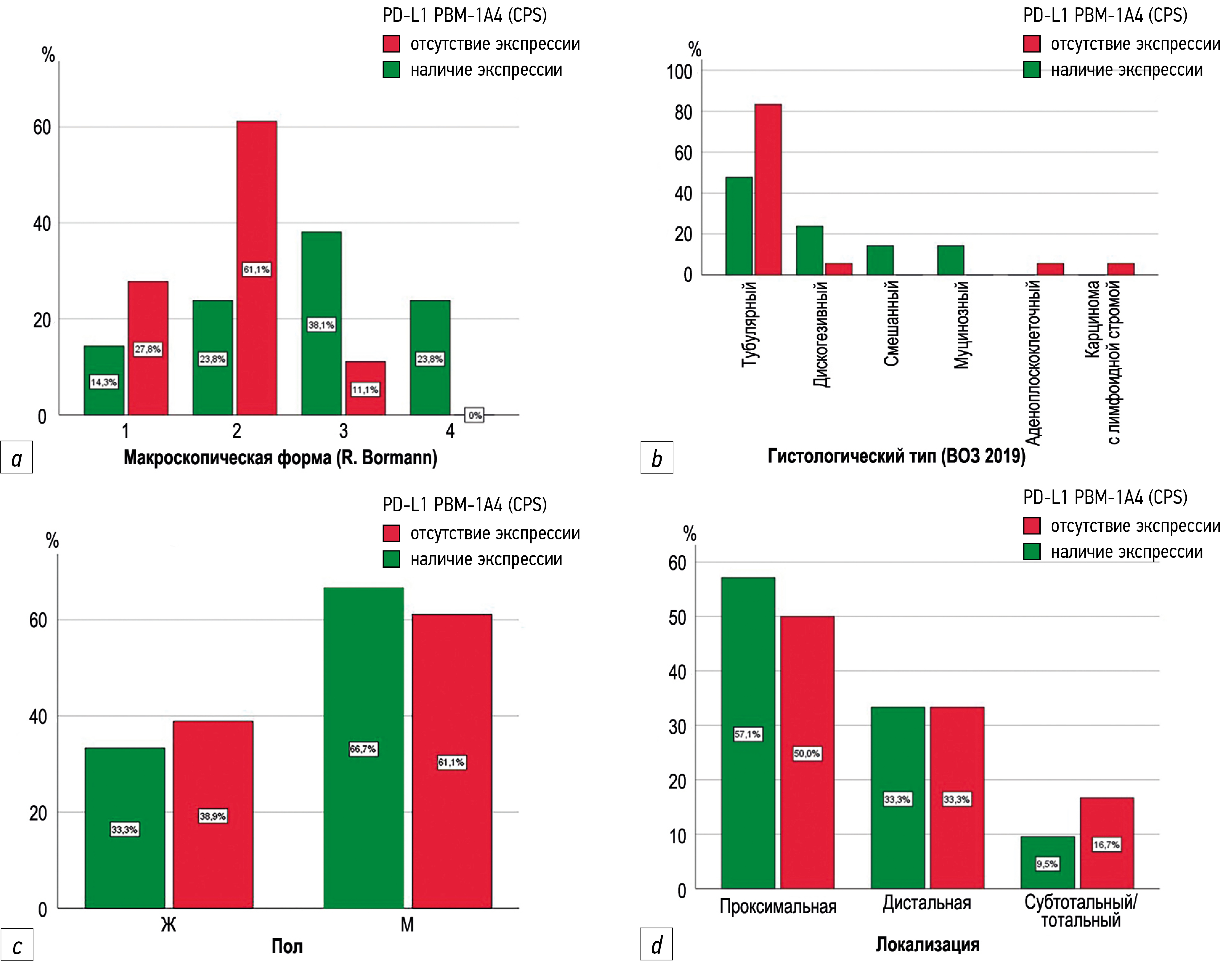 Рис. 3. Структурные диаграммы для пациентов в группах PD-L1(PBM-1A4)-негативных и PD-L1(PBM-1A4)-позитивных опухолей: а — распределение по макроскопической форме опухолей; b — распределение по гистологическому типу опухолей; c — структурная диаграмма распределения по полу; d — структурная диаграмма распределения дистальной/проксимальной локализации опухолей.