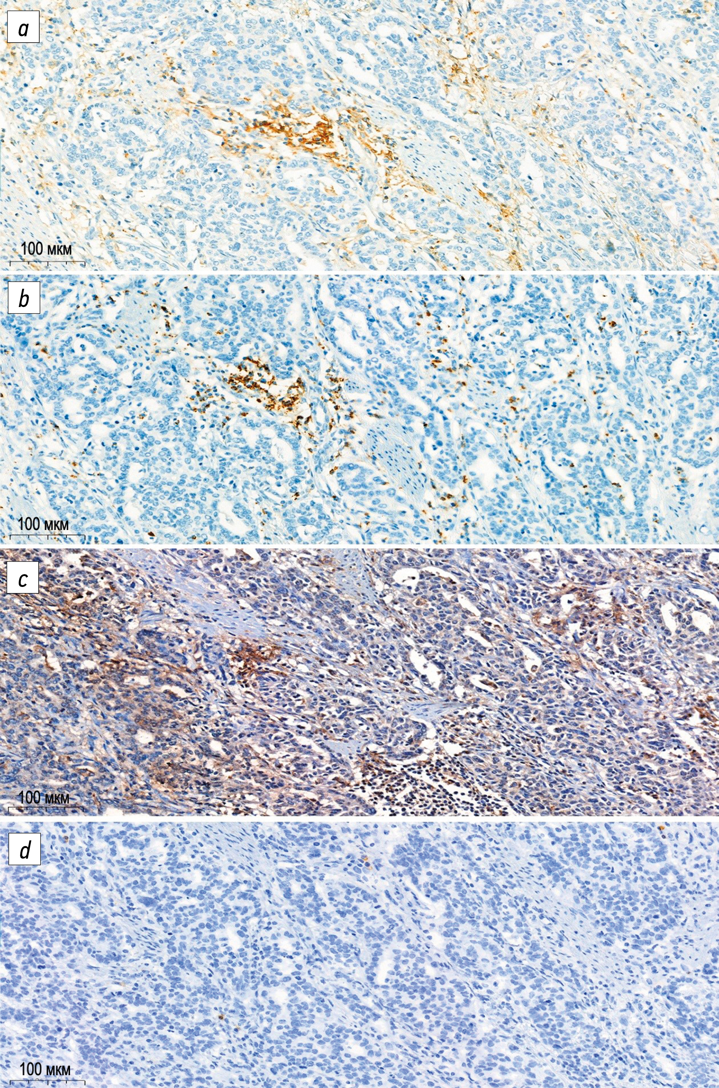 Рис. 4. Сопоставление экспрессии PD-L1, выявленной различными клонами в тубулярной карциноме желудка: а — положительная экспрессия PD-L1 SP263 в опухоли (2 балла); b — положительная экспрессия PD-L1 SP142 в опухоли (2 балла); c — положительная экспрессия PD-L1 22C3 в опухоли (3 балла); d — отсутствие экспрессии PD-L1 PBM-1A4 в той же опухоли.