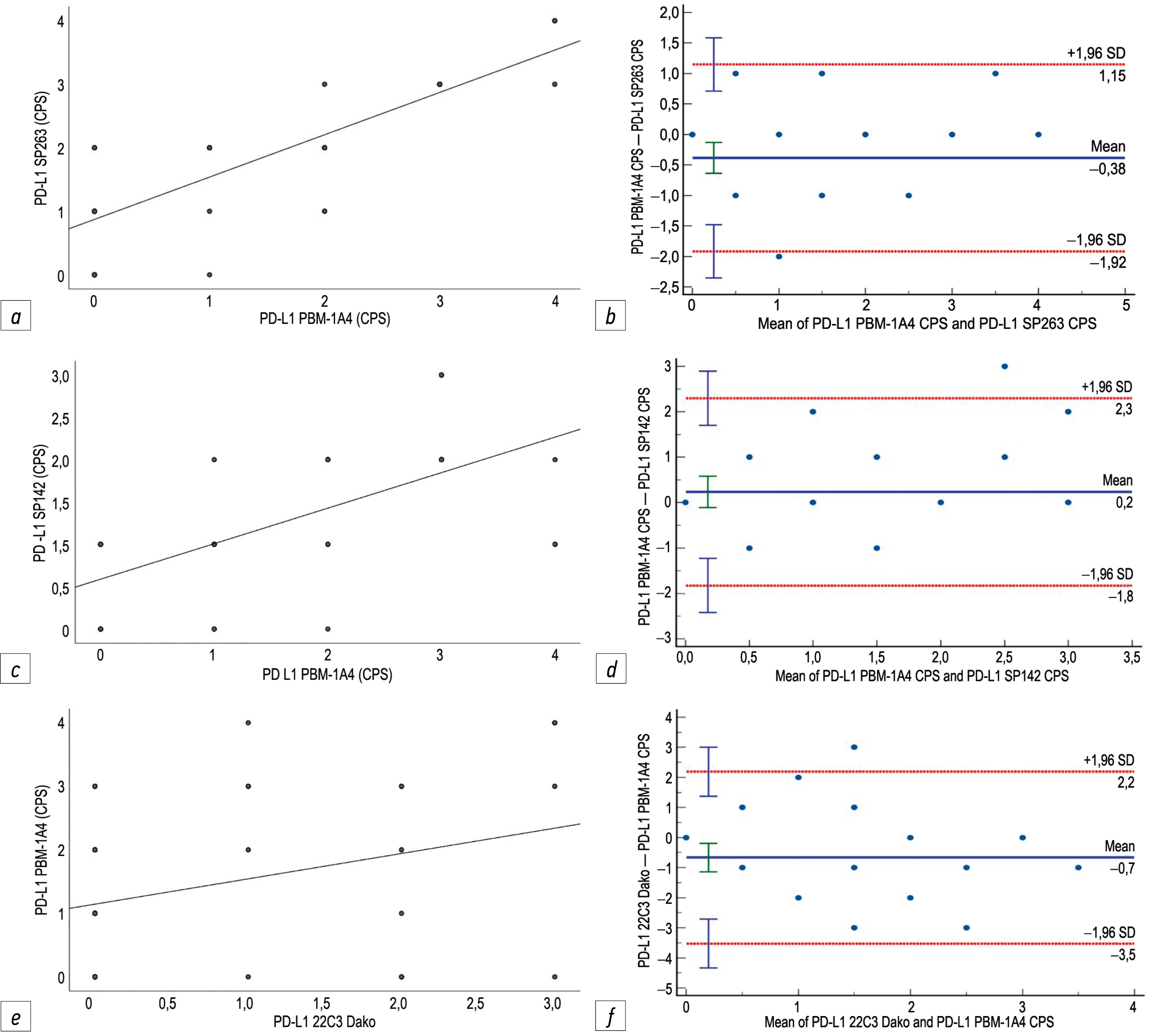 Fig. 5. Statistical indicators for comparison of clones PBM-1A4, SP263, SP142, 22С3: a — correlation between PD-L1 expression detected by clones SP263 and PBM-1A4; b — Bland–Altman plot to visualize the average difference in CPS between clones PD-L1 SP263 and PD-L1 PBM-1A4; c — correlation between PD-L1 expression detected by clones SP142 and PBM-1A4; d — Bland–Altman plot to visualize the average difference in CPS between clones PD-L1 SP142 and PD-L1 PBM-1A4; e — correlation between PD-L1 expression detected by clones 22C3 and PBM-1A4; f — Bland–Altman plot to visualize the average difference in CPS between clones PD-L1 22C3 and PD-L1 PBM-1A4.
