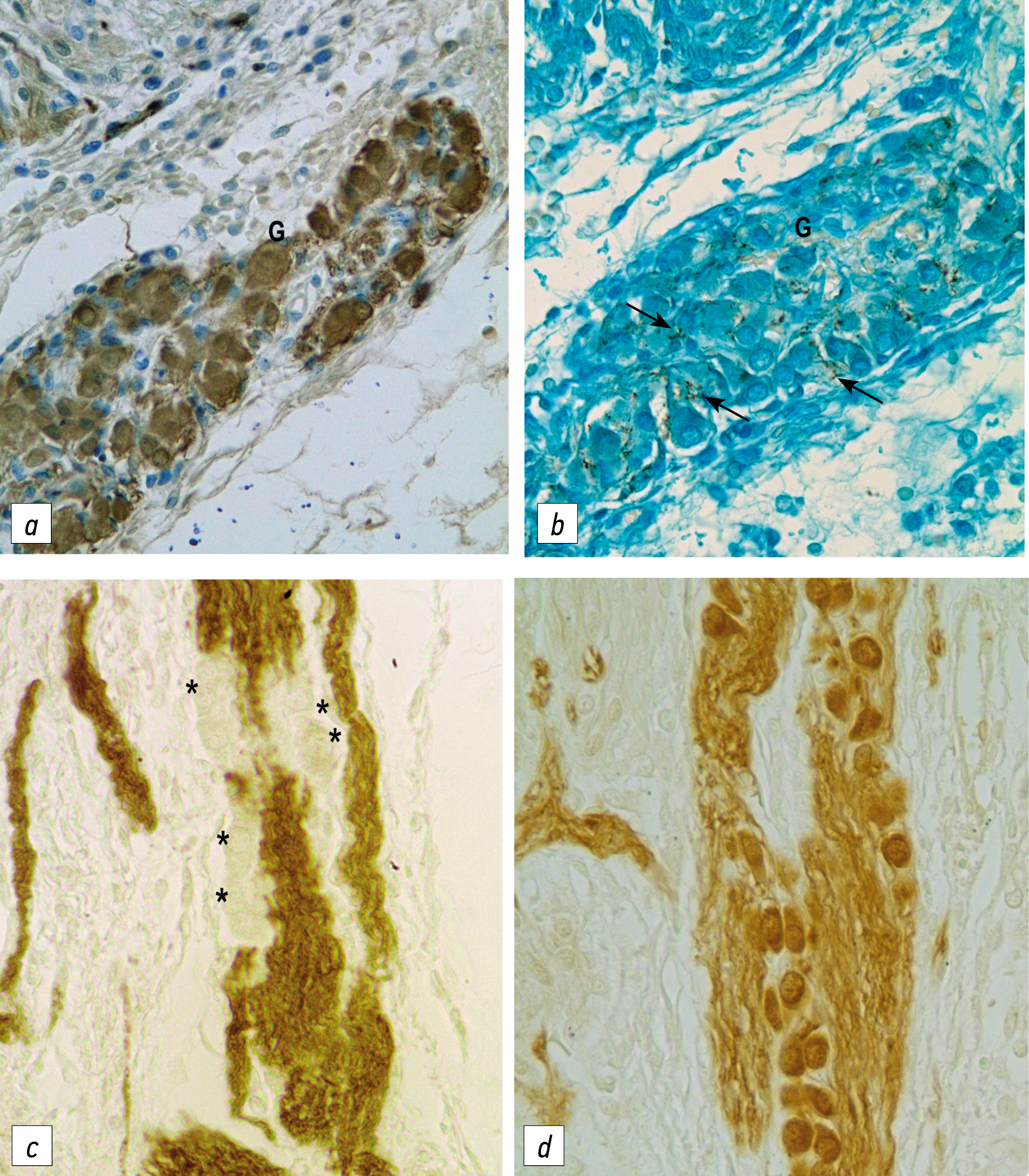 Fig. 2. Neural structures in the newborn rat mediastinum: ↑↑ — differentiating synapses of preganglionic fibers on TH–/PGP 9.5+ ganglion neurons (G), * TH-immunonegative neurons in the sympathetic nerve trunk. Immunohistochemical reactions to PGP 9.5 protein (а, d), synaptophysin (b) and tyrosine hydroxylase (c); ×400. TH — tyrosine hydroxylase.
