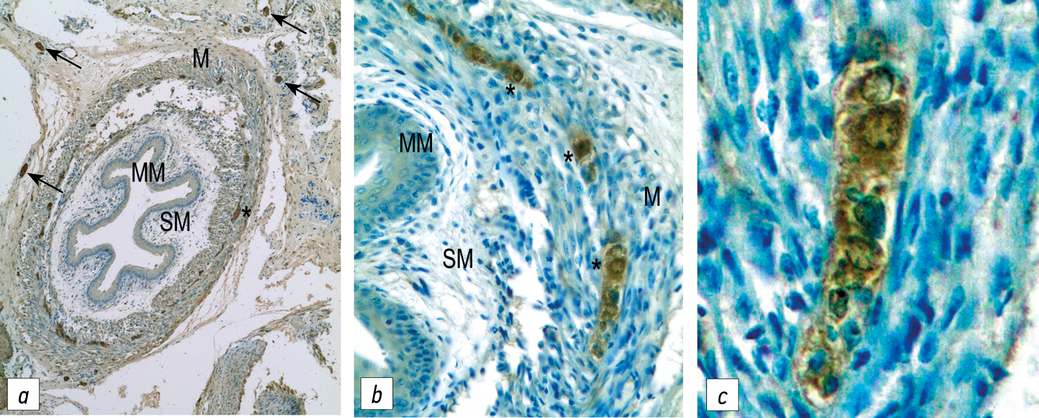 Fig. 3. Nervous structures in the wall of the esophagus of a newborn rat in the mediastinum. MM — mucous membrane, SM — submucosa, M — muscular shell of the esophageal wall; * nerve cells of the Auerbach plexus; ↑↑ — bundles of nerve fibers. Immunohistochemical reaction to PGP protein 9.5; ×40 (а), ×100 (b), ×400 (c).