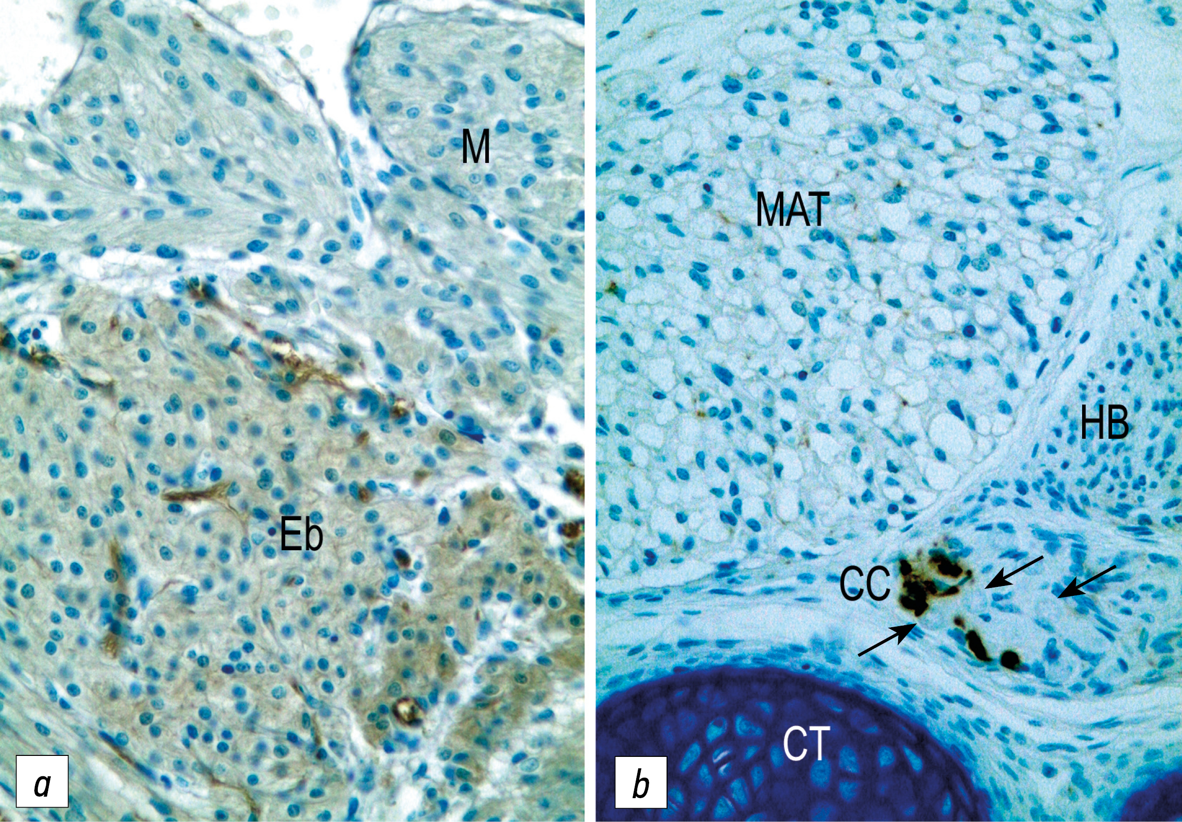 Fig. 4. Fragments of adipose tissue of a newborn rat mediastinum, at different stages of its functional state and development: a — epithelial body, b — mixed adipose tissue, consisting of brown and white adipocytes. M — atrial myocardium, Eb — epithelial body, CC — chromaffin cells, ↑↑ — TH-immunonegative parasympathetic neurons; НВ — nerve fibers of the vagal nerve; MAT — mixed adipose tissue, CT — cartilage tissue. Immunohistochemical reaction to PGP 9.5 protein (a) and tyrosine hydroxylase (b); toluidine blue; ×100.