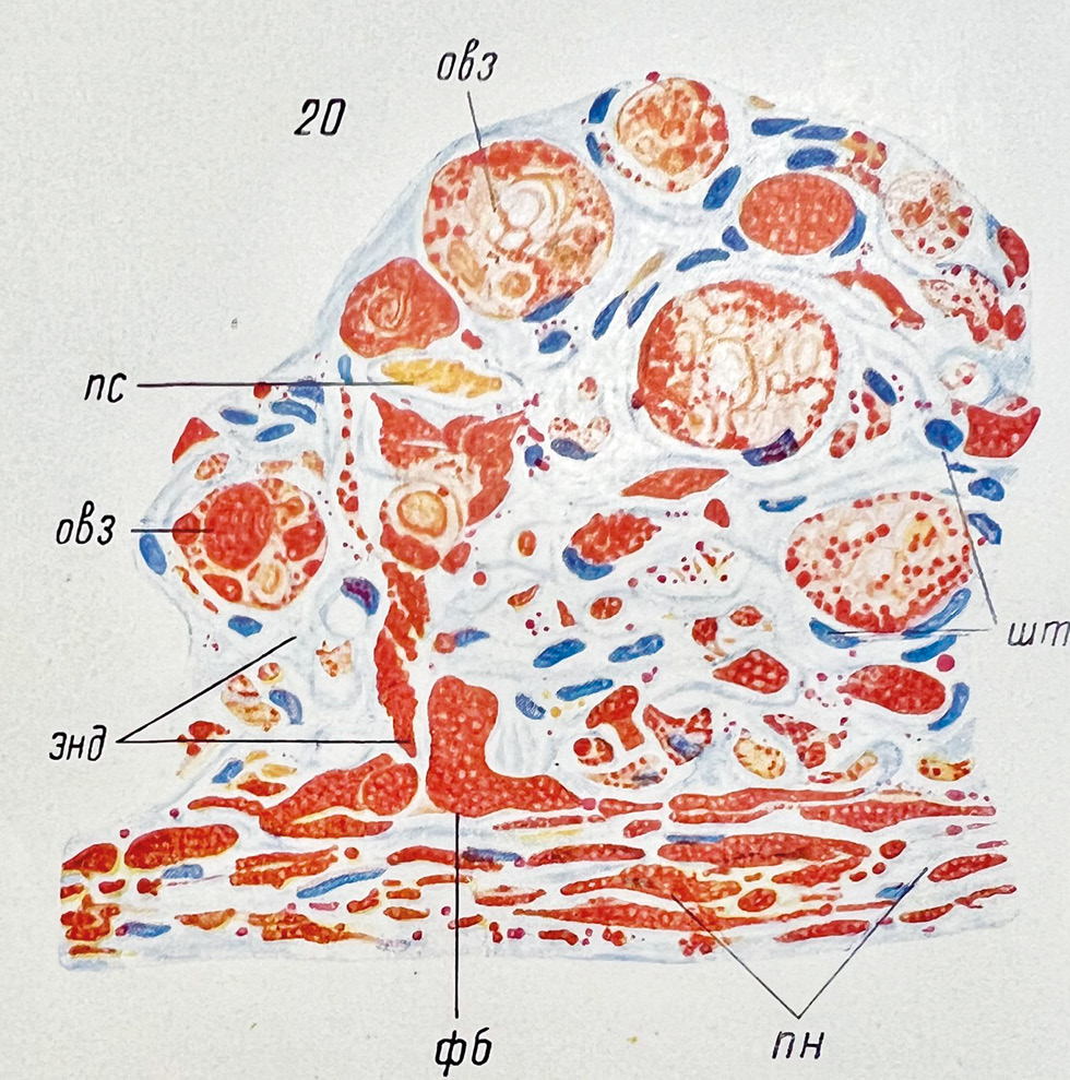 Fig. 3. Drawings from scientific paper by B.S. Doynikov — сross-section through the peripheral portion of the transected sciatic nerve of a rabbit 6 weeks after injury: шт — plasma Schwann bands; энд — endoneurium; фб — fibroblast filled with fat droplets; пс — vessel lumen; овз — cross-section of ovoid swellings of vesicular cells; пн — perineurium, elements of which contain a large number of lipoid inclusions. Sudan III staining. Adapted from [6]. © Doynikov BS, 1955.
