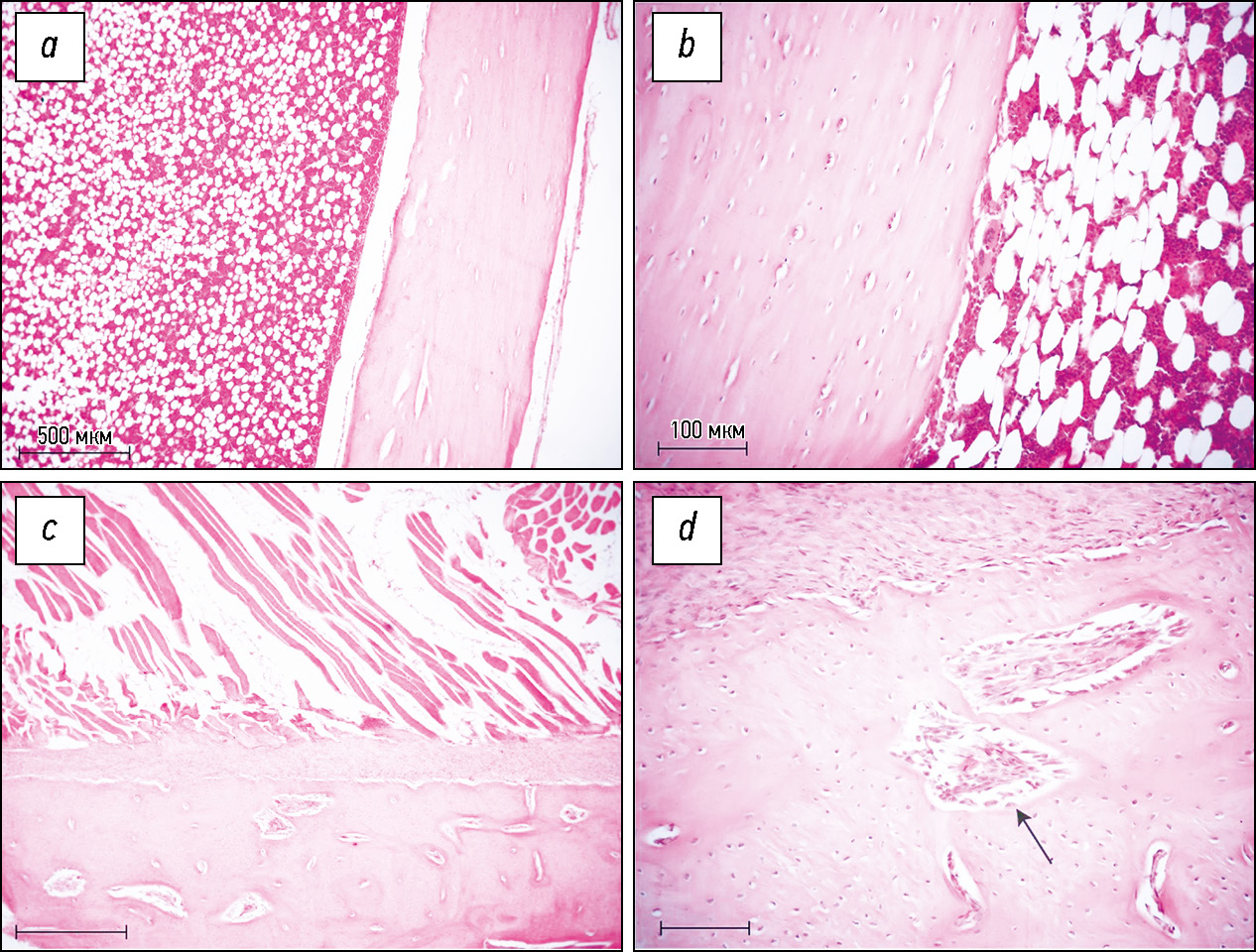 Fig 3. A section of an intact bone diaphysis: a, b — rabbit from group 1, lamellar bone tissue of the compact bone substance and red bone marrow in the medullary canal; c, d — rabbit from group 2, c — compact bone substance in the periosteal zone, striated muscle fibers of typical structure; d — numerous osteoblasts with morphological signs of high synthetic activity in the periosteal zone of bone (indicated by arrow). Hematoxylin and eosin staining, magnification: a, c — ×50; b, d — ×200.