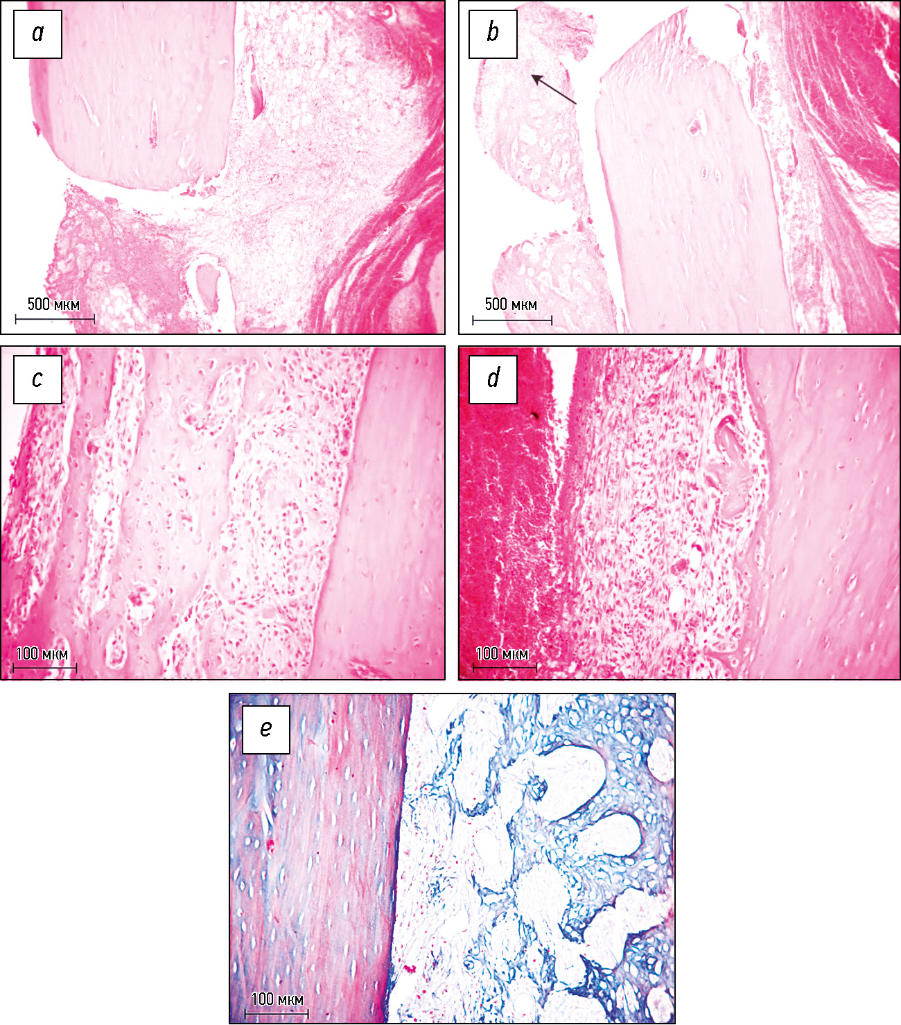Fig. 5. A section through the proximal metaphysis of the rabbit femur seven days after heating the diaphysis to a temperature of 55–60 ℃ in the medullary canal: a — signs of mechanical trauma; a, b, d — hemorrhages; b — cartilage overgrowth (indicated by arrow); e — coarse fibrous bone overgrowth in the periosteal zone of the bone; c — numerous osteoblasts and large osteoclasts in the periosteal zone; d — numerous osteoblasts and large osteoclasts in the and endosteal zone of the bone. Staining: a–d — haematoxylin and eosin; e — Mallory’s staining; magnification: a, b — ×50; c, d, e — ×200.