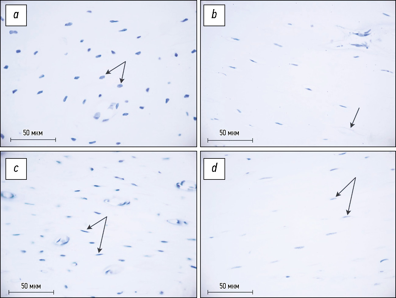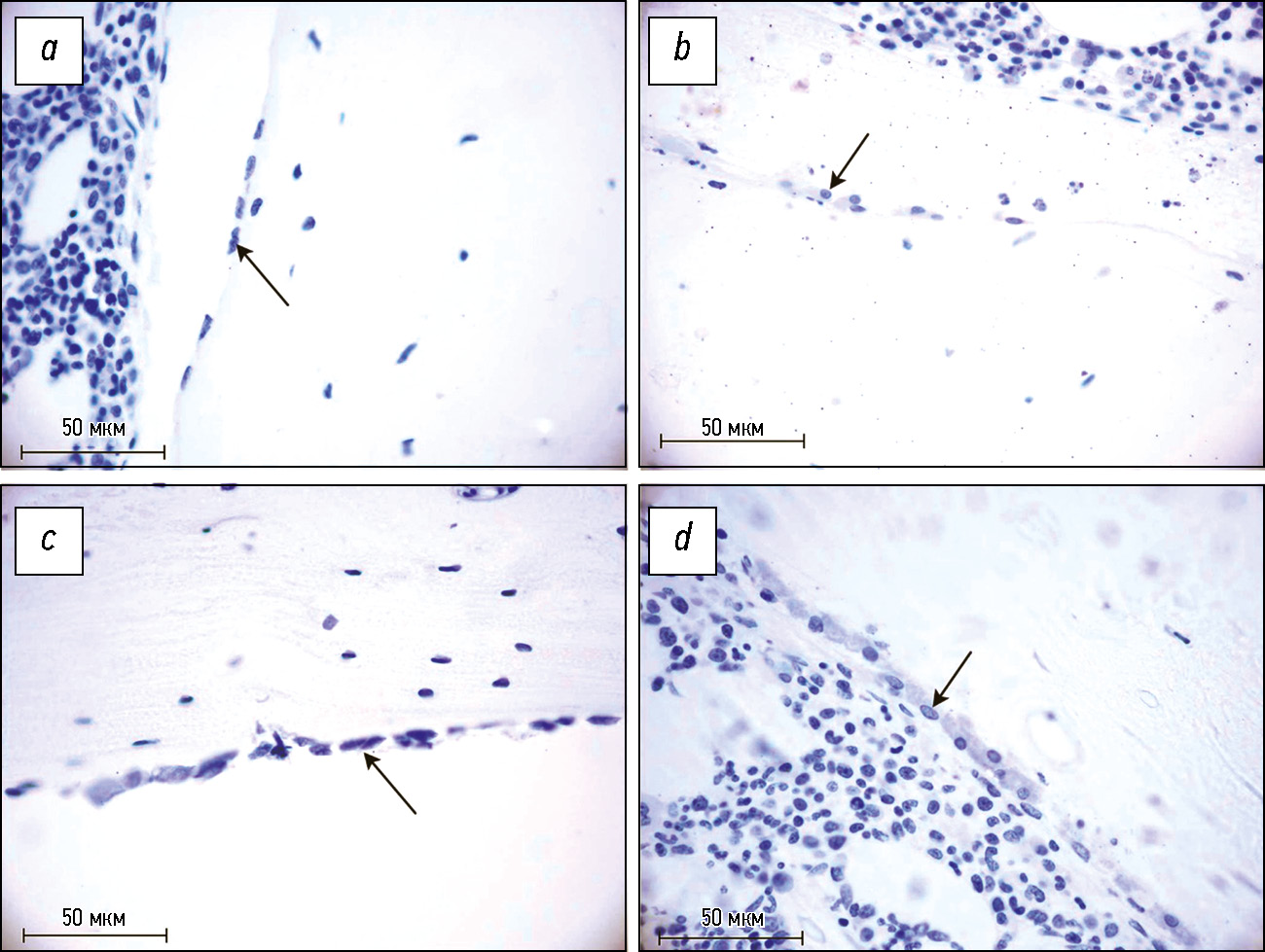 Fig. 7. A section through the femoral diaphysis in the endosteal zone: a — intact bone of rabbit from group 1; c — intact bone of rabbit from group 2; b — femur of group 1 three days after heating; d — femur of rabbit from group 2 seven days after heating at a temperature in the medullary canal of 55–60 ℃.; a, c — osteoblasts with morphological signs of high synthetic activity (indicated by arrows); b, d — osteoblasts with morphological signs of low synthetic activity (indicated by arrows). Einarson staining, magnification ×630.