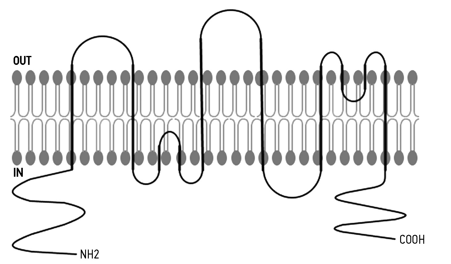 Fig. 2. Structure of the aquaporin-4 monomer: the protein spans the membrane six times, forming two intramembrane and three extramembrane loops. Adapted with modifications from Peng S et al., 2023 [24].