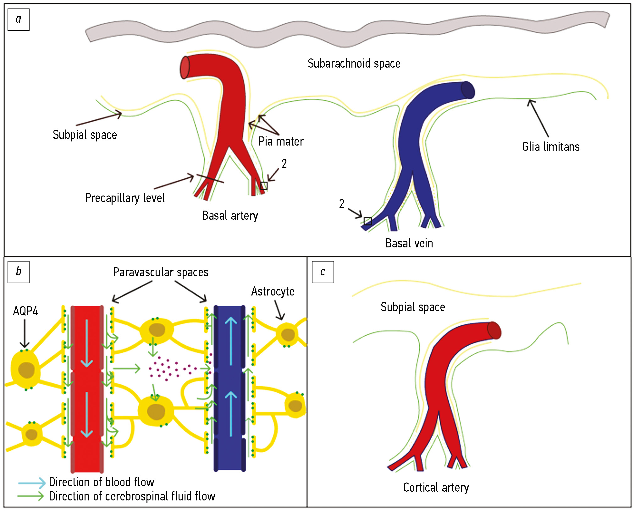 Our knowledge about the glymphatic system has improved greatly since its discovery. However, a review of numerous publications on this topic revealed significant discrepancies in the terminology. There are two main theories of the CSF outflow. The paravascular theory describes the drainage of interstitial fluid through slit-like channels located between the walls of blood vessels and adjacent brain tissue, also known as Virchow—Robin spaces. The perivascular theory considers the CSF flow through channels formed by the middle layer of the arterial wall, the basement membranes of single smooth muscle cells of arterioles, and the basement membranes of endothelial cells of capillaries. The two terms are often used interchangeably in most foreign papers [15–22], which makes it difficult to clearly define and determine the relationship between these two mechanisms. However, it is clear that an unambiguous understanding of the basic mechanisms of the glymphatic system is required to develop new strategies to improve them.