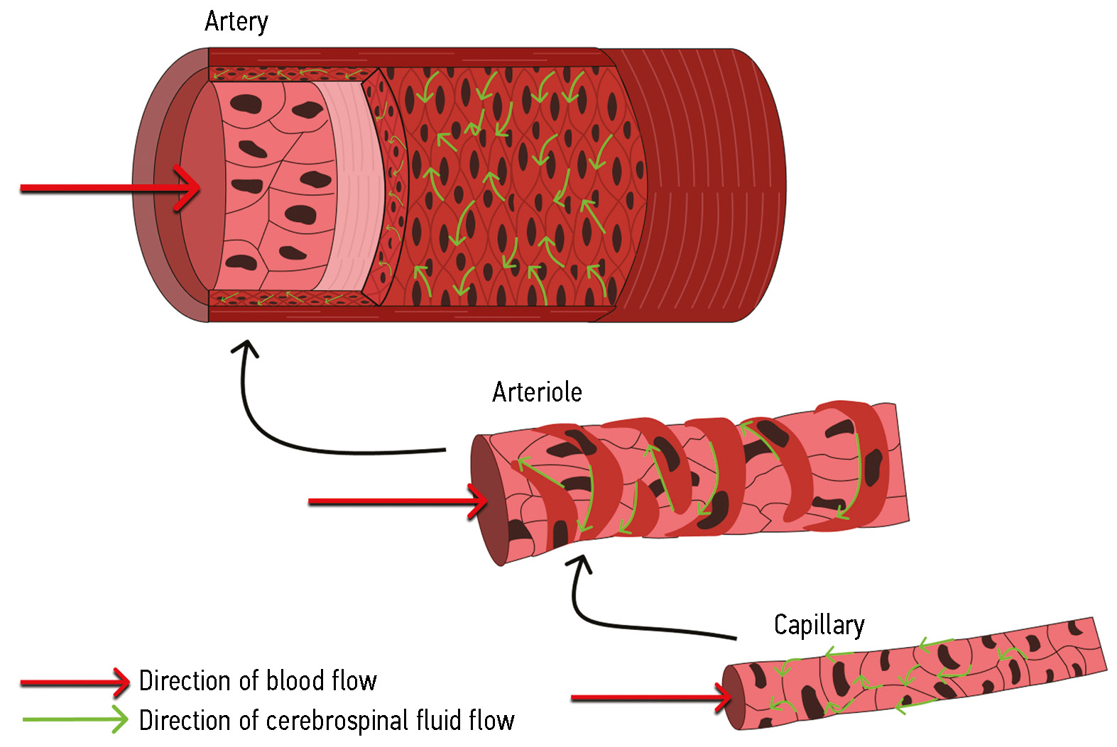 Fig. 3. Cerebrospinal fluid flow through perivascular spaces: the direction of cerebrospinal fluid flow is opposite to that of blood flow; cerebrospinal fluid flow moves along the basal membranes between endothelial cells of capillaries, single smooth muscle cells of arterioles, and between layers of smooth muscle cells in arteries. Original illustration by the authors.