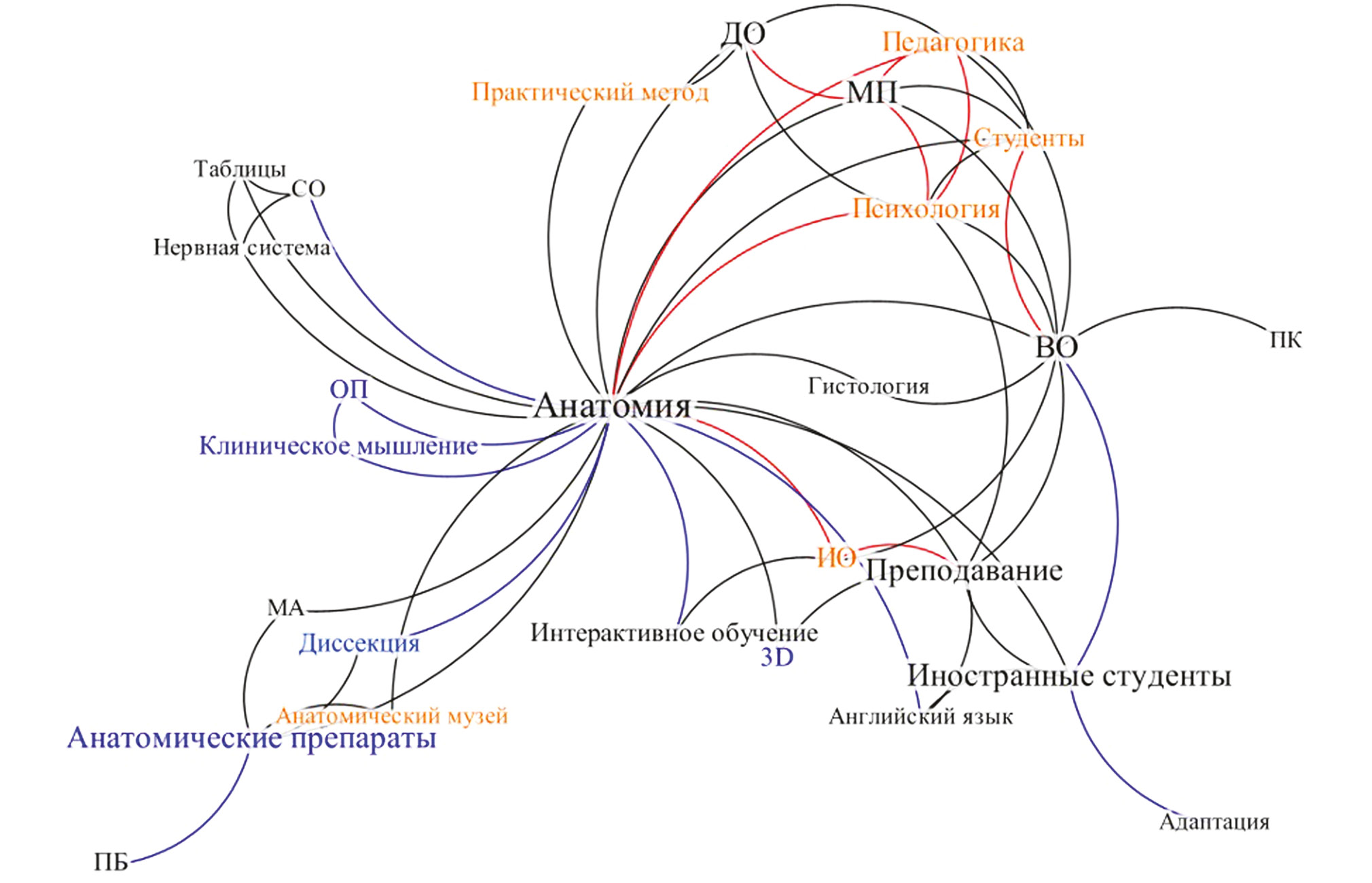 Рис. 1. Взаимоотношения ключевых слов: ВО — высшее образование; ПК — профессиональные компетенции; ИО — инновационное обучение; ДО — дистанционное обучение; МП — методы преподавания; ОП — образовательная программа; МА — методы анатомирования; ПБ — полимерное бальзамирование; СО — современные подходы к обучению. Крупным шрифтом обозначены термины, наиболее часто встречающиеся в литературе; красным цветом — термины с нарастающей частотой употребления и их связи; синим цветом — термины со снижающейся частотой употребления и их связи.