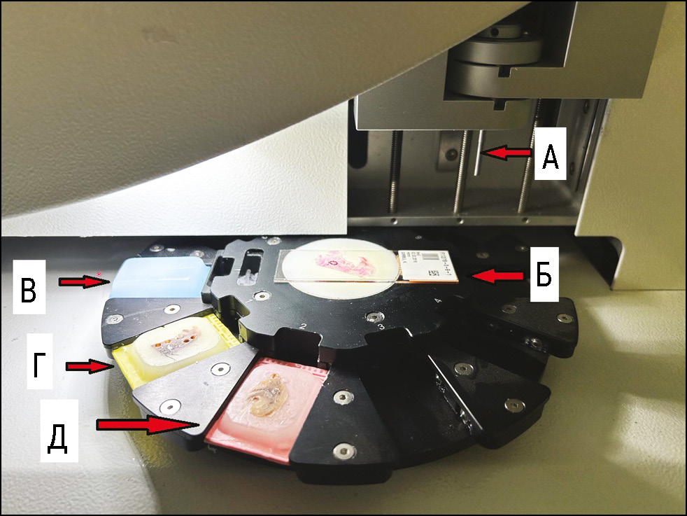 Рис. 1. Устройство для автоматического позиционирования панч-иглы: А — панч-игла; Б — гистологический препарат с отмеченной областью интереса, препарат окрашен гематоксилином и эозином и находится в центре ротатора для позиционирования; В — блок-реципиент; Г — блок-донор №1; Д — блок-донор №2.