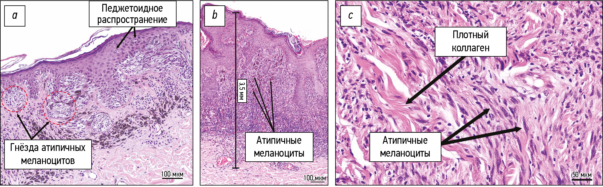 Рис. 1. Гистологические подтипы меланомы кожи: a — поверхностно распространяющаяся меланома (8743/3), толщина по Breslow 0,7 мм (pT1a); b — узловая меланома (8721/3), толщина по Breslow 3,5 мм (pT3a); с — десмопластическая меланома (8745/3), толщина по Breslow 4,2 мм (pT4a). Окрашивание гематоксилином и эозином; увеличение a, b ×200, c ×400.