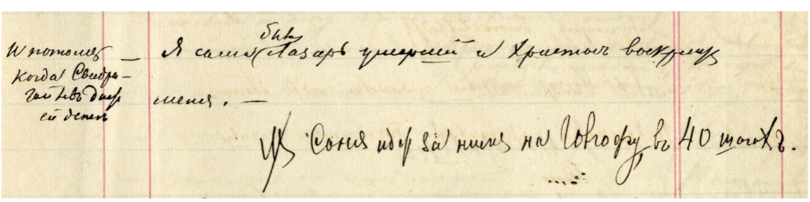 Воскресъ из мерт<выхъ>. Что же случилось? То что онъ отдалъ свои послѣдн<iя> день<ги> — это что ли<?> Какой вздоръ. Дѣвочка эта? Сон<я>? — Не то, а все вмѣстѣ» (ОР РГБ. Ф. 93.I.1.2/4. Л. 8 об.).