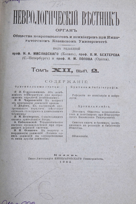 K. Abraham. Ueber Versuche mit “Veronal” bei Erregungszuständen der Paralytiker. (Centralblatt für Nervenheilkunde und Psychiatrie, 15 Marz 1904). Observation of the action of "veronal" in paralytics in the state of excitement