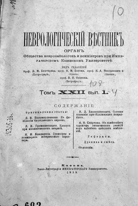 Protocol of the V-th appointment of the Society of neuropathologists and psychiatrists at the Imperial Kazan University on May 7, 1914
