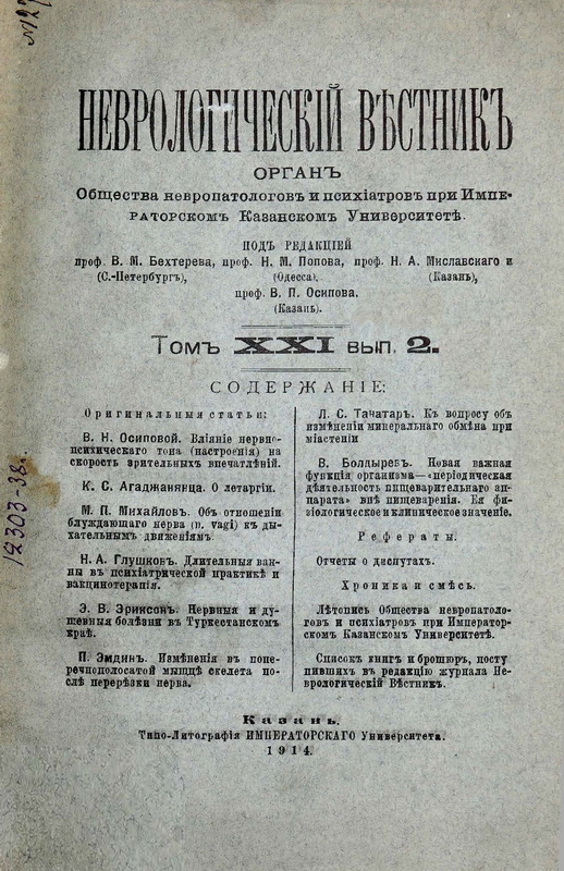 The history of the Society of Neuropathologists and Psychiatrists at the Imperial Kazan Universityѣ February 26, 1914. Protocol II session of the Society of Neuropathologists and Psychiatrists at the Imperial Kazan University on February 26, 1914