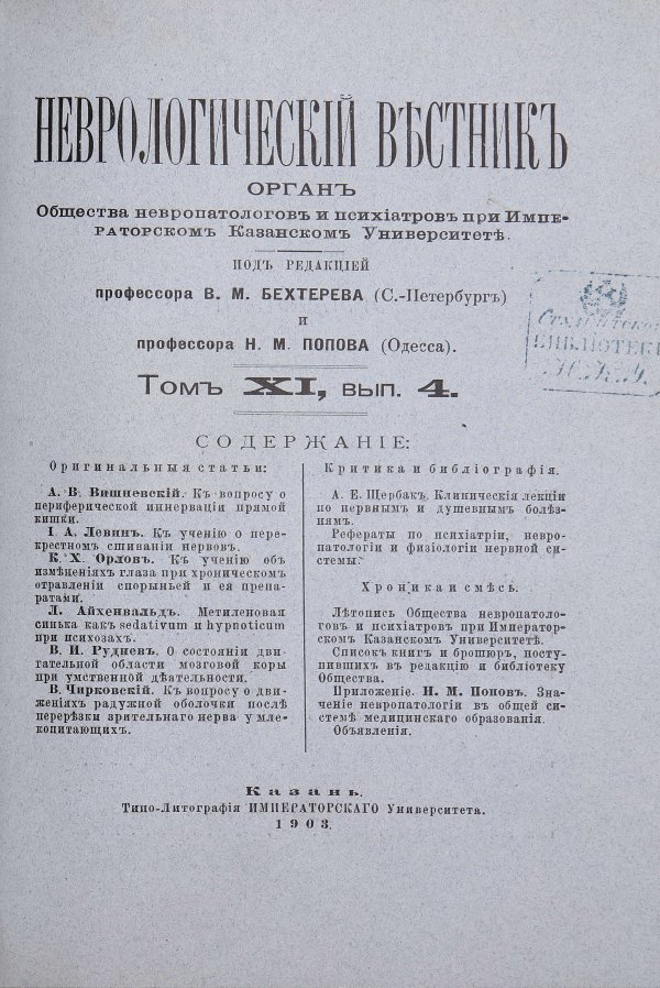 The history of the society of neuropathologists and psychiatrists at the Imperial Kazan University. Volume XI, No. 4 (1903)