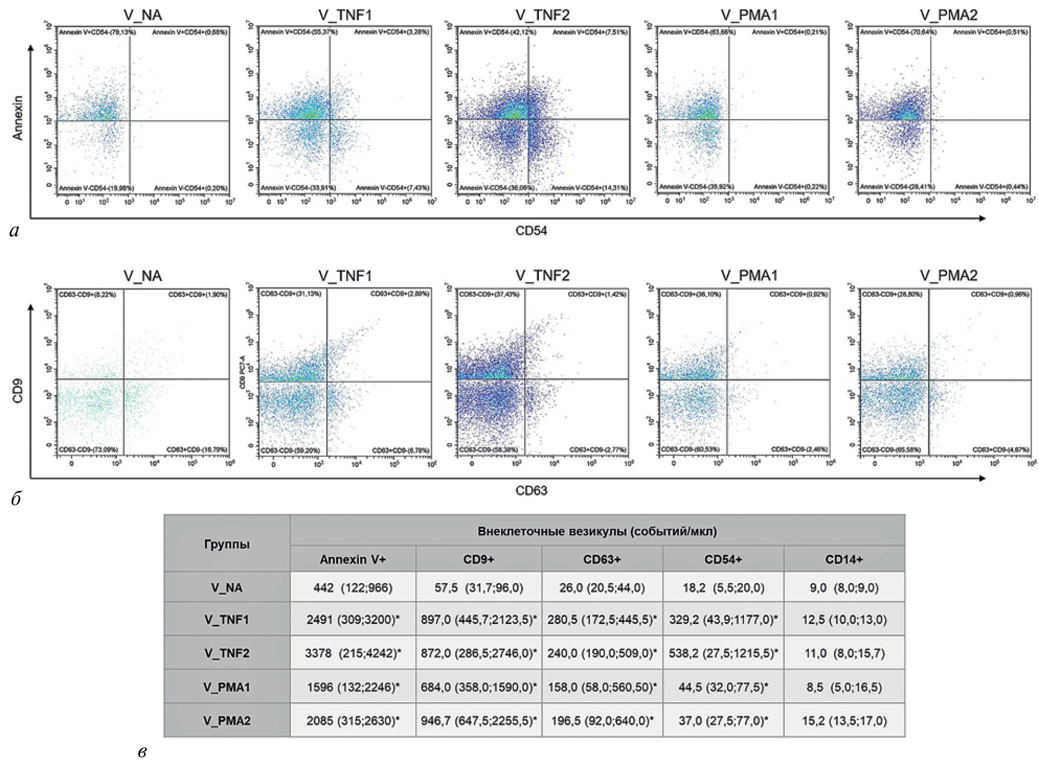 В образцах ВВ, полученных от стимулированных клеток (TNF и PMA), был более высокий уровень CD9+ и CD63+ объектов, т. е. несущих тетраспаниновые рецепторы, по сравнению с таковым от нестимулированных клеток. Кроме того, в образцах, полученных при стимуляции TNF, отмечалось повышенное содержание CD54-позитивных событий. Таким образом, морфология и качественный состав использованных в исследовании внеклеточных везикул различались в образцах в зависимости от использованных активаторов.