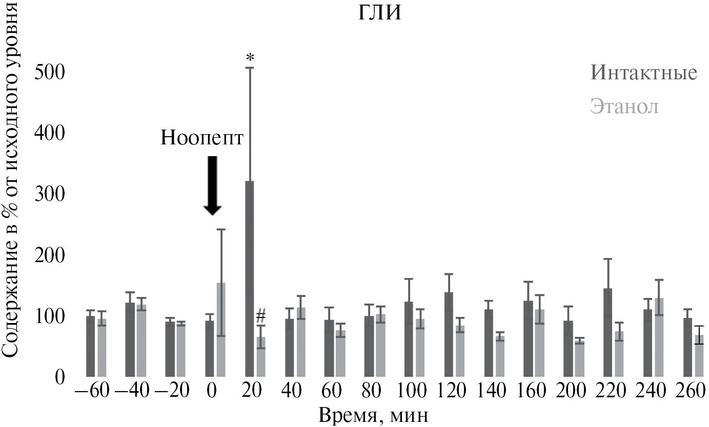 Рис. 5. Влияние ноопепта при однократном системном введении на содержание глицина (ГЛИ) в гиппокампе беспородных крыс. *р < 0.05 по сравнению с уровнем в исходном состоянии покоя; #р < 0.05 по сравнению с интактными крысами, согласно дисперсионному анализу (ANOVA) planned comparison с последующим множественным анализом Ньюмена—Кейлса.