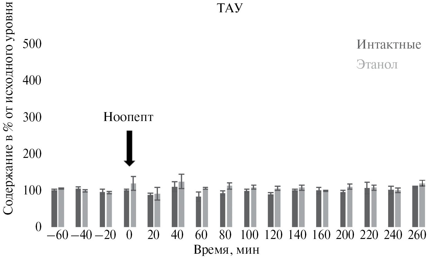 Рис. 6. Влияние ноопепта при однократном системном введении на содержание таурина (ТАУ) в гиппокампе у беспородных крыс.