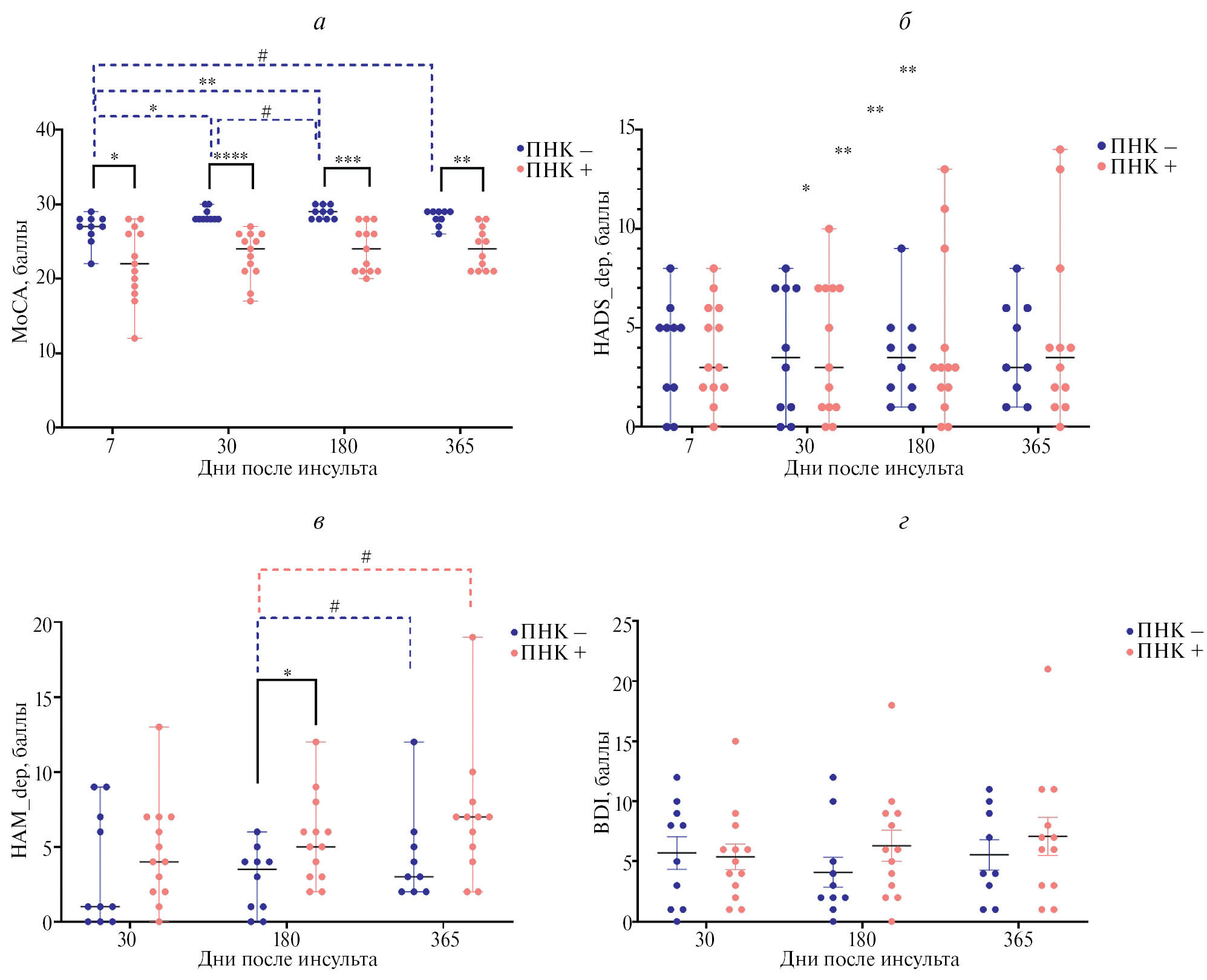 Рис. 3. Динамика изменения баллов по психометрическим шкалам. В каждый момент времени было проведено сравнение групп с ПКН и без него и оценена динамика для каждой группы. Использованные шкалы: MoCA (а), HADS (б), HAM (в), BDI (г). Статистические различия между группами оценивали с помощью критерия Манна—Уитни для шкал MoCA, HADS, HAM и непарный t-критерий для шкалы BDI: #p < 0.1, *p < 0.05, **p < 0.01. Статистические различия динамики внутри групп оценивали с помощью критерия Вилкоксона для шкал MoCA, HADS, HAM и парного t-критерия для шкалы BDI: *p < 0.05, **p < 0.01, ***p < 0.001, ****р < 0.0001. Данные на графиках а, б и в представлены как медиана с размахом. Данные на графике г представлены как M ± SEM.