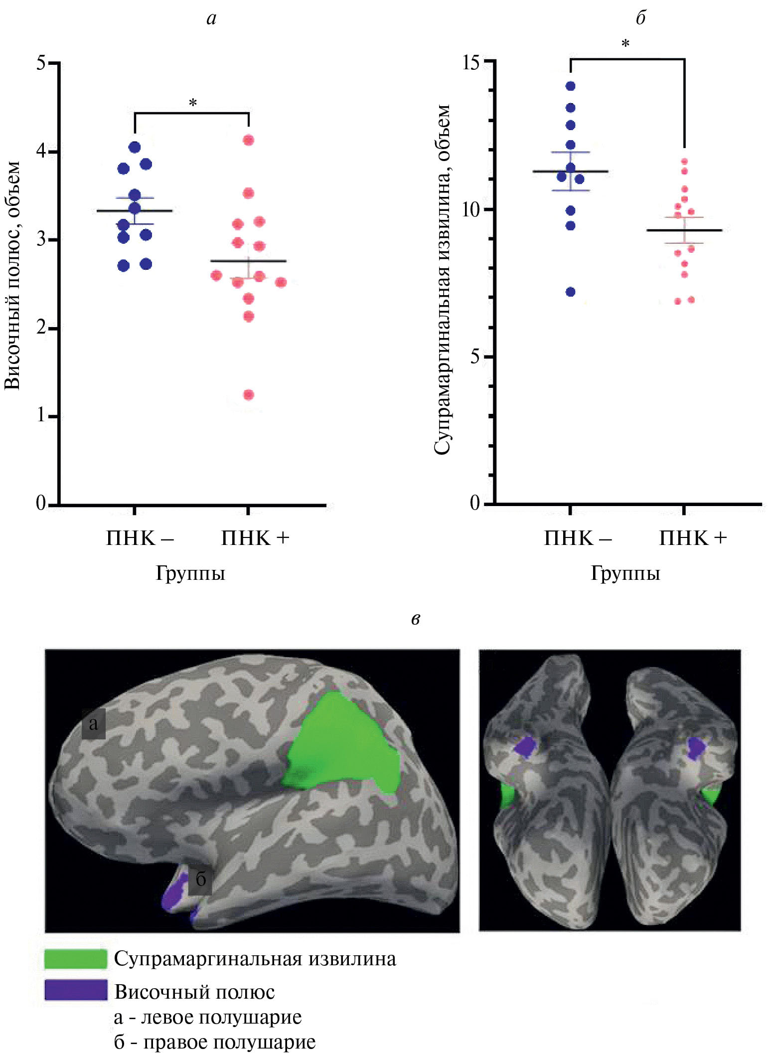 Рис. 5. Относительные объемы височного полюса (а) и супрамаргинальной извилины (б) в группах с ПКН и без них. Статистические различия между группами оценивали с помощью непарного t-критерия: *p < 0.05. Все данные представлены как M ± SEM. Показано расположение височного полюса и супрамаргинальной извилины (в).