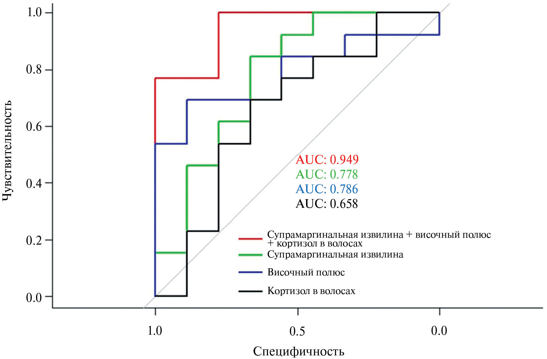 Был проведен множественный логистический регрессионный анализ, в модель были включены предикторы, которые в совокупности оказали максимальное влияние на развитие ПКН (рис. 6). Наиболее эффективными предикторами оказались: объем супрамаргинальной извилины (β0 = 3.41; β = –0.99; p = 0.047), объем височного полюса (β0 = 3.41; β = –3.12; p = 0.06), уровень кортизола в волосах на 1-й день после ИИ, отражающий уровень накопленного стресса в течение месяца перед ИИ (β0 = 3.41; β = –0.05; p = 0.08). Для этой модели псевдо R2 был равен 0.51.