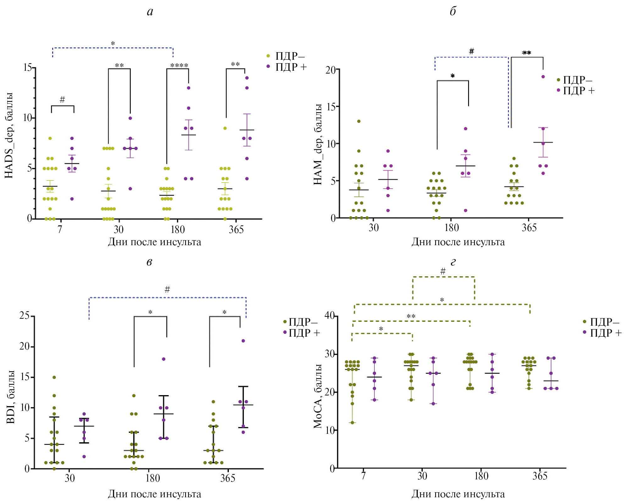 Клинические данные. По данным шкал HADS, HAM и BDI психоэмоциональный статус пациентов в группах с ПДР и без него стал достоверно отличаться как на 30-й (шкала HADS, рис. 7, а), так и на 180-й день после ИИ (HAM и шкалы BDI, рис. 7, б, в). Достоверных различий между группами по шкале MoCA не было выявлено, однако положительная динамика показателей MOCA наблюдалась в группе больных без ПДР, начиная с 30-го дня после ИИ (рис. 7, г).