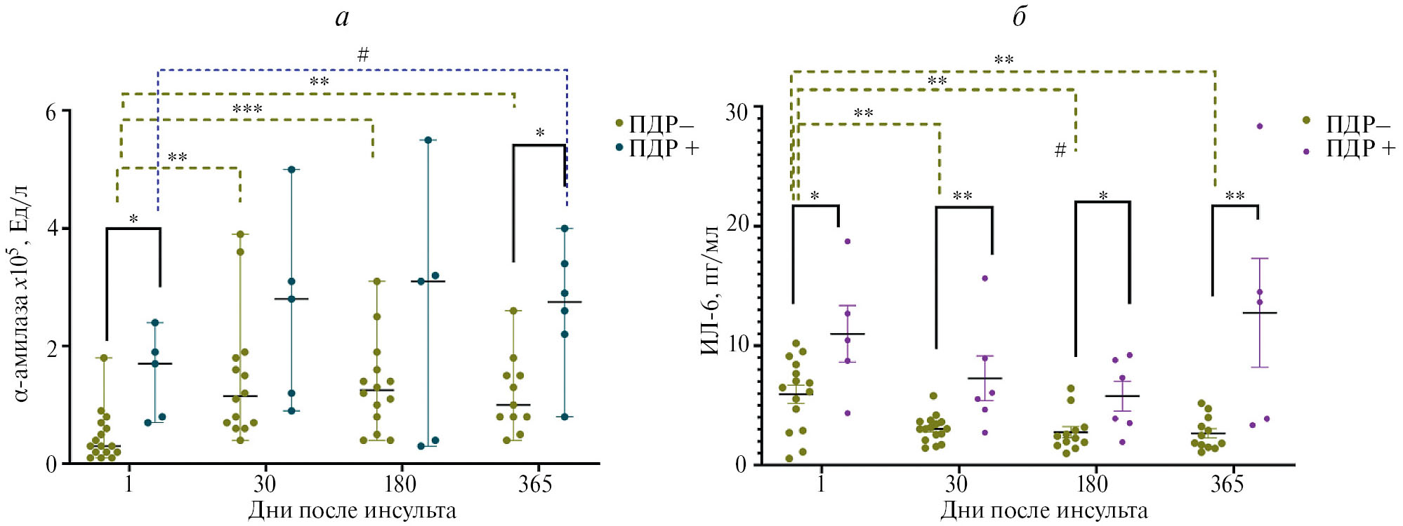 Рис. 8. Динамика содержания α-амилазы в слюне (а) и ИЛ-6 в сыворотке крови (б) в группах с ПДР и без него. Статистические различия между группами оценивали с помощью критерия Манна—Уитни для α-амилазы в слюне (а), а по непарному t-тесту для ИЛ-6 в сыворотке крови: *p < 0.05, **p < 0.01. Статистические различия в динамике оценивали по критерию Вилкоксона для α-амилазы в слюне и по парному t-критерию для ИЛ-6 в сыворотке крови: #p < 0.1, *p < 0.05, **p < 0.01, ***p < 0.001. Данные на графике а представлены как медиана с размахом. Данные на графике б представлены как M ± SEM.