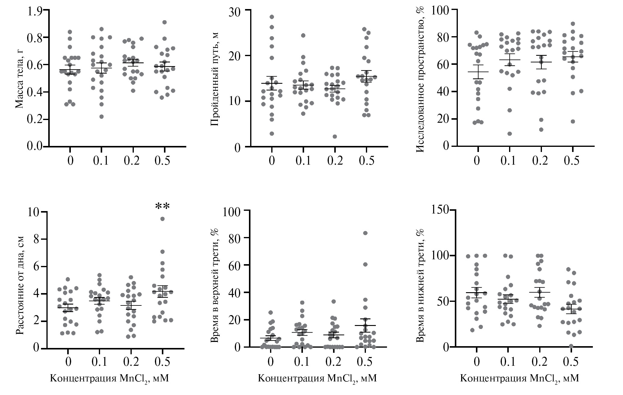 Рис. 2. Масса тела (г), пройденный путь (м), доля обследованного пространства (%), расстояние от дна (см), время нахождения (%) в верхней и нижней третях кюветы у рыб, содержащихся в течение 10 дней в воде с 0 (контроль), 0.1, 0.2, 0.5 мМ MnCl2. Точки представляют индивидуальные значения показателей. Черты представляют средние значения ± ошибки средних по каждому аквариуму. Каждая из 4 групп включала по 20 рыб.