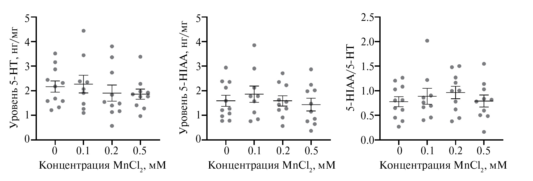 Рис. 3. Уровень 5-HT (нг/мг), уровень 5-HIAA (нг/мг) и отношение 5-HIAA/5-HT в мозге рыб, содержащихся в течение 10 дней в воде с 0 (контроль) (n = 11), 0.1 (n = 9), 0.2 (n = 10), 0.5 (n = 10) мМ MnCl2. Точки представляют индивидуальные значения показателей. Черты представляют средние значения ± ошибки средних по каждому аквариуму.
