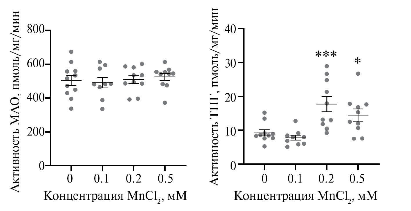 Рис. 4. Активности МАО (пмоль/мг/мин) и ТПГ (пмоль/мг/мин) в мозге рыб, содержащихся в течение 10 дней в воде с 0 (контроль) (n = 11), 0.1 (n = 9), 0.2 (n = 10), 0.5 (n = 10) мМ MnCl2. Точки представляют индивидуальные значения показателей. Черты представляют средние значения ± ошибки средних по каждому аквариуму.
