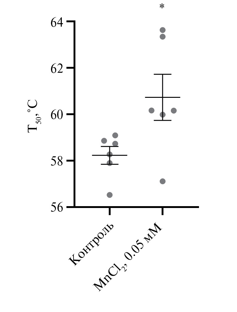 Для проверки предположения, что ионы Mn повышают стабильность, время жизни и, как следствие – число активных молекул ТПГ и общую активность фермента, мы исследовали влияние 0.05 мМ MnCl2 на температурную стабильность и величину Т50 ТПГ in vitro. Было показано, что 0.05 мМ MnCl2 увеличивало Т50 ТПГ на 2.5°С (с 58.24°С до 60.74°С, F(1,10) = 5.53, p = 0.04, рис. 5).