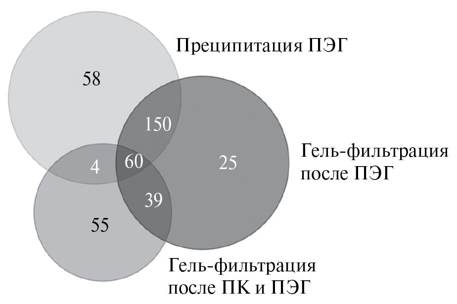 С использованием трех методов выделения ЭВ были получены фракции, несколько различающиеся по белковому составу. Однако за единичными исключениями все выделенные белки, а это продукты 272 генов при выделении с помощью ПЭГ, 274 генов при выделении с помощью ПЭГ и гель-фильтрации и 158 генов при выделении с помощью ПЭГ, обработки ПК и гель-фильтрации, принадлежат к белкам ЭВ согласно базе данных Vesiclepedia.