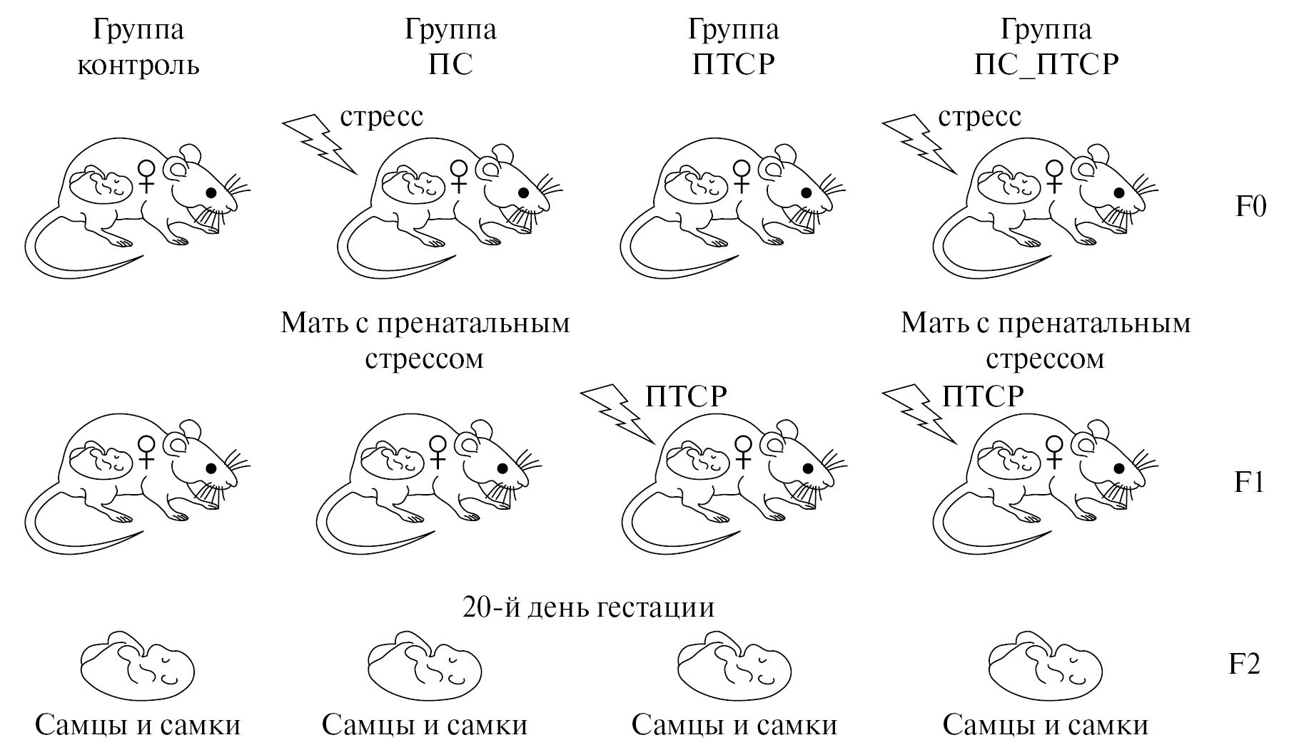 Этап 2. Далее из потомков F1 в возрасте 3 месяца создавались 4 группы животных: интактные беременные крысы (контроль), пренатально стрессированные беременные крысы (ПС), беременные крысы, у которых моделировалось ПТСР в период подсадки и покрытия (ПТСР), пренатально стрессированные беременные крысы у которых моделировалось ПТСР в период подсадки и покрытия (ПС_ПТСР).