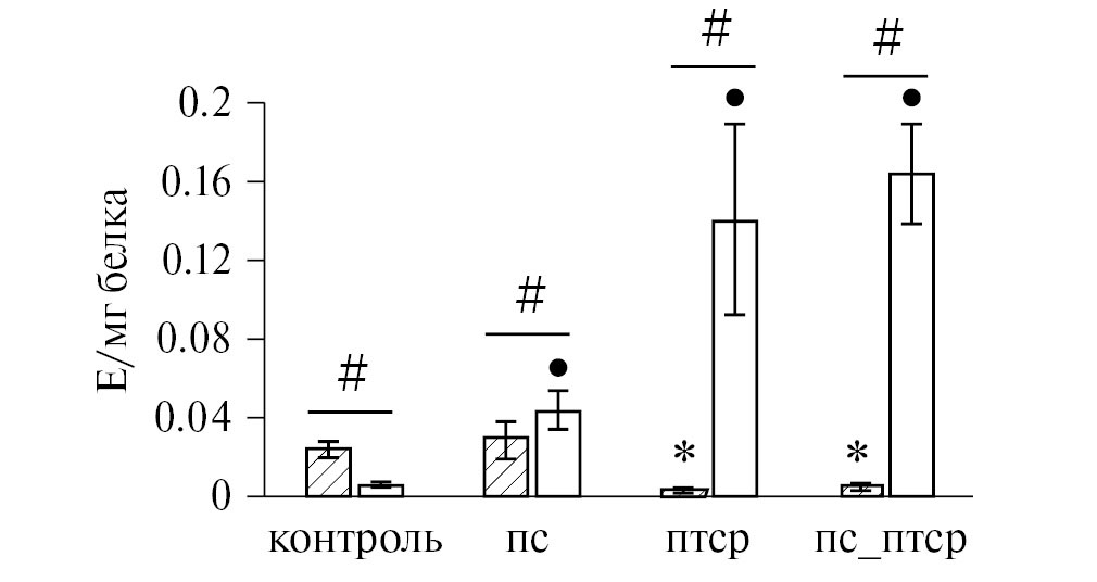 Рис. 7. Содержание восстановленного глутатиона в мозге у эмбрионов (самцы – заштрихованные столбики, самки – светлые столбики) в контроле и экспериментальных группах. * – статистически значимые отличия от контроля у эмбрионов-самцов p < 0.05; • – статистически значимые отличия от контроля у эмбрионов-самок; p < 0.05; # – статистически значимые межполовые различия, p < 0.05; данные представлены в виде среднее + стандартное отклонение