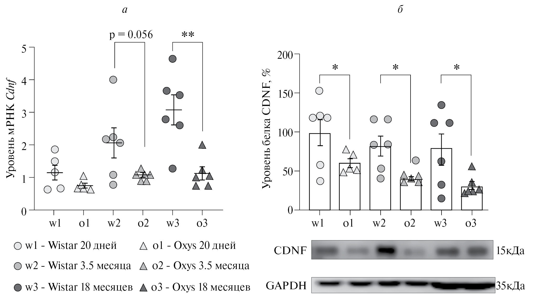 На уровень белка CDNF повлияла принадлежность к линии (F (1, 28) = 15.89: p = 0.0004; рис. 2б), но не возраст (F(2, 28) = 2.017; p > 0.05). При апостериорном анализе нами было выявлено снижение уровня CDNF у крыс OXYS по сравнению с Вистар во всех возрастных точках (p = 0.0492; p = 0.0317; p = 0.0146). Взаимодействия факторов линия × возраст не выявлено (F(2, 28) = 0.048; p > 0.05).