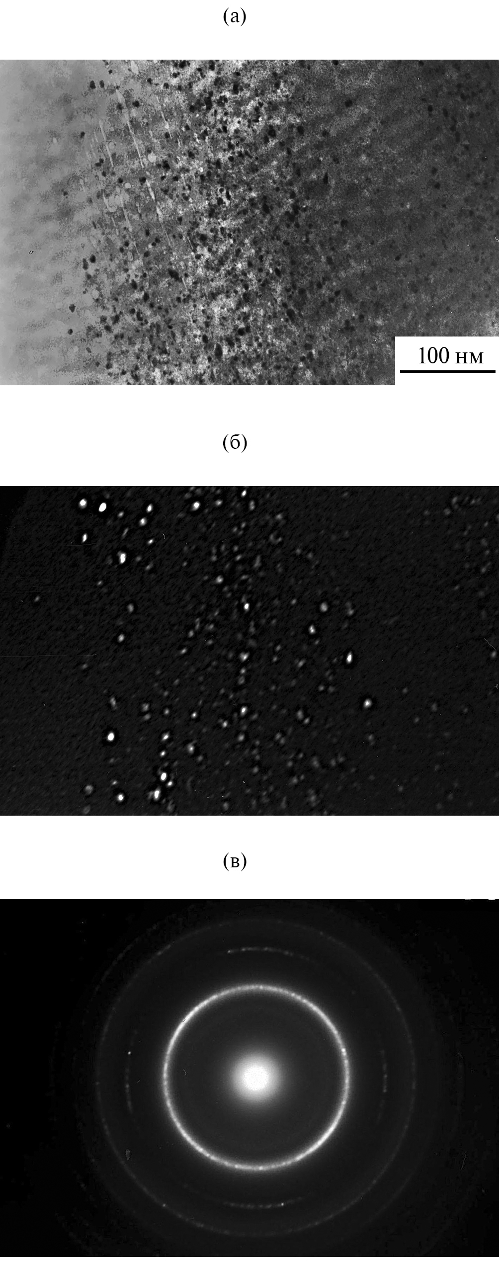 При увеличении степени деформации количество нанокристаллов Al возрастает. Образующаяся при КВД (e = 6.5) структура показана на рис. 4. Видно, что нанокристаллы располагаются как в ПС, так и в области, примыкающей к ПС. На электронограмме (рис. 4в) присутствуют рефлексы от нанокристаллов Al, при ориентации образца в соответствии с одним из которых и было получено темнопольное изображение (рис. 4б).